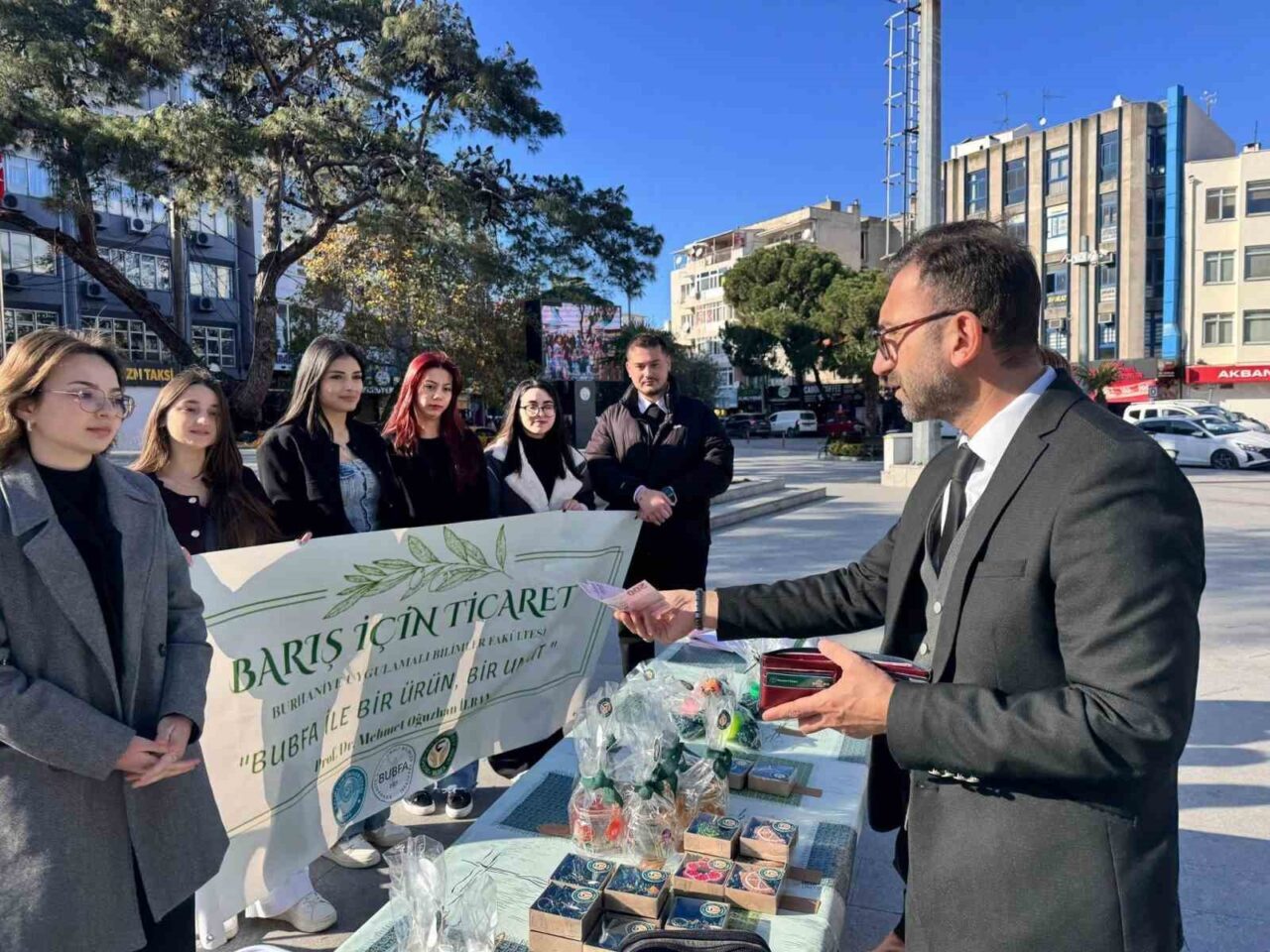 Balıkesir Üniversitesi Burhaniye Uygulamalı Bilimler Fakültesi, sosyal sorumluluk çalışmaları kapsamında Filistinli çocukların eğitimine yönelik anlamlı bir projeye imza attı. Fakülte öğrencileri tarafından hayata geçirilen “BUBFA ile Barış İçin Ticaret” projesi, Burhaniye Cumhuriyet Meydanı’nda kurulan satış standında gerçekleştirildi.