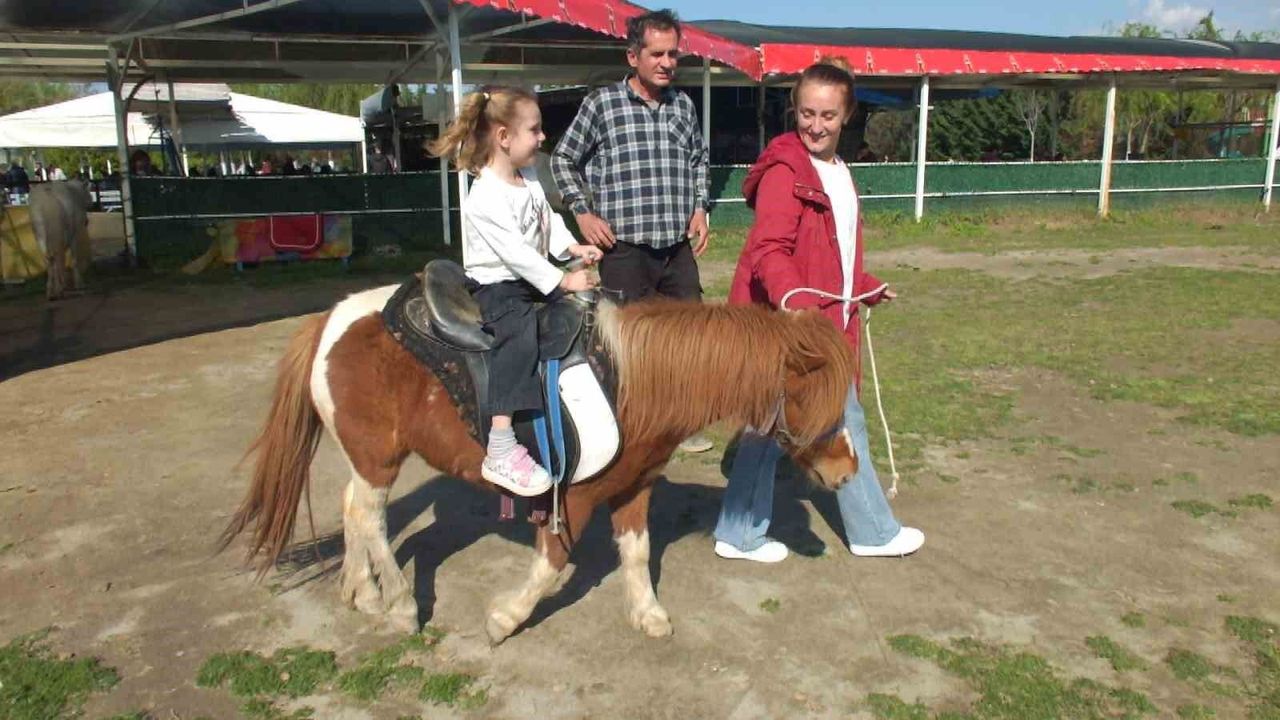Burhaniye ilçesinde, Ören Meço Tatil Sitesi yanında bulunan Mila Garden işletmesine gelen çocuklar, at binerken mutluluk yaşadı. Midilli pony atlarına binen çocuklar, at binmeyi herkese tavsiye ettiklerini belirtti.