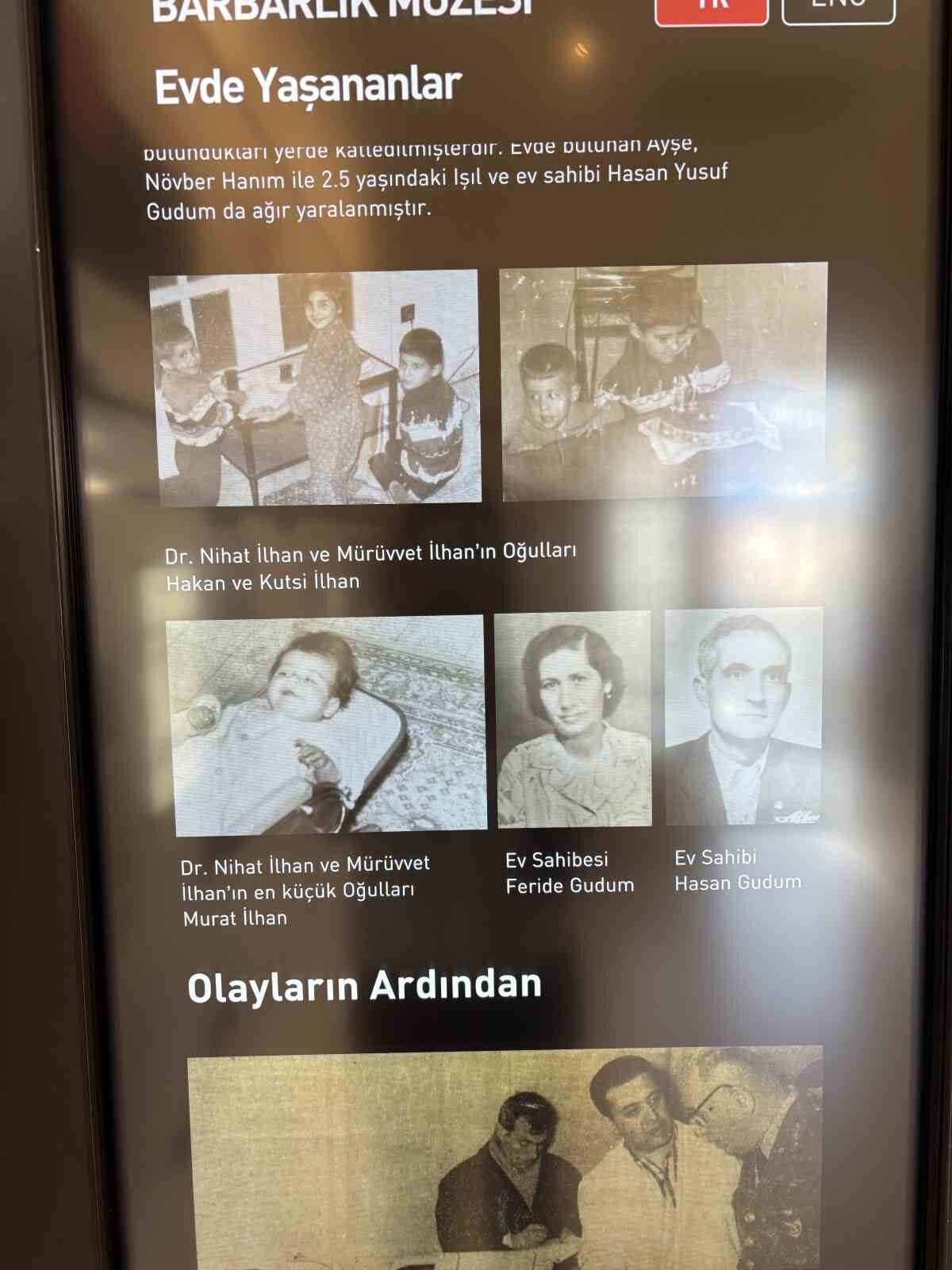 Tourist guide Ulviye Mehtap, Barbarlık Müzesi’nde gerçekleştirilen Kıbrıs Türklerine yönelik kanlı saldırının tarihini anlatıyor. “24 Aralık’ı 25 Aralık’a bağlayan gece, Tabip Binbaşı Nihat İlhan’ın eşi, üç çocuğu ve evde bulunan bir misafir EOKA’cı Rumlar tarafından katledildi. Nihat İlhan görevdeyken, bu mahallede gerçekleşen saldırılar sırasında, evdeki kadınlar ve çocuklar korkudan saklanmaya çalıştı. EOKA’cılara direniş gösteren bu evin kapısında dışarıya ait bir kurşun izi yok, fakat içeriden ateş açıldığı anlaşılıyor.” ifadelerini kaydetti.