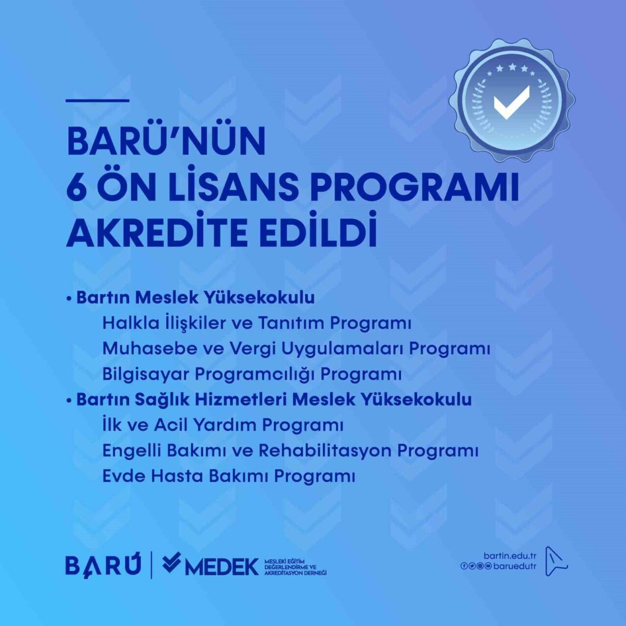 Bartın Üniversitesinin (BARÜ) 6 ön lisans programı, Mesleki Eğitim Değerlendirme ve Akreditasyon Derneği (MEDEK) tarafından akredite edilme başarısı göstermiştir.