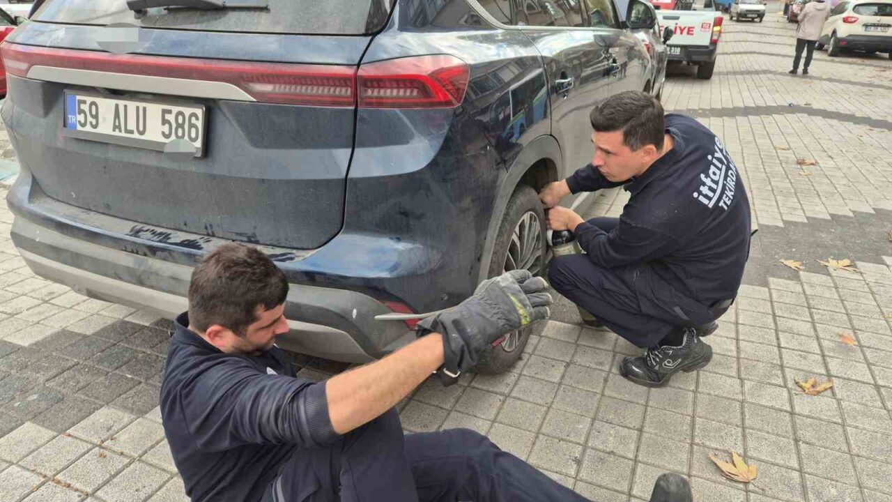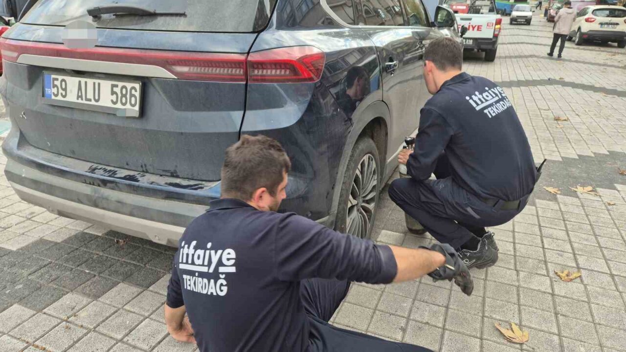 TEKİRDAĞ’IN SÜLEYMANPAŞA İLÇESİNDE CUMHURİYET MEYDANI’NDA PARK HALİNDEKİ TOGG OTOMOBİLİN ARKA LASTİK KISMINA GİREN KEDİ, İTFAİYE EKİPLERİNİN HAVA TÜPÜYLE YAPTIĞI DİKKATLİ ÇALIŞMA SONUCU ZARAR GÖRMEDEN KURTARILDI.