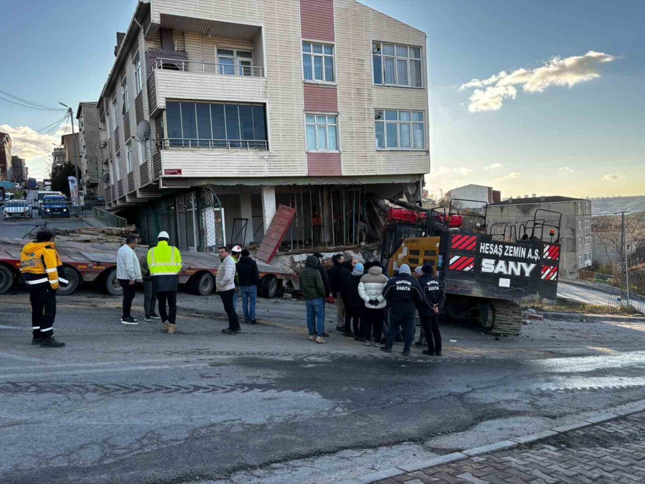 Olay, sabah saatlerinde Güvercintepe Mahallesi Gökdemir Caddesi üzerinde meydana geldi. İş makinesinin çektiği tırın arkasında taşınan bir vinç düştü ve 2 araca ile bir binaya çarptı. İhbar üzerine olay yerine polis, sağlık, itfaiye ve elektrik ekipleri sevk edildi. Ekipler, olası bir çökme riskine karşı 4 daire ve 3 dükkandan oluşan binayı boşaltarak 30 kişiyi güvenli alana tahliye etti. Dev vinci binadan çıkarma çalışmaları, vinç operatörleri ve itfaiye ekiplerinin koordinesinde titizlikle yürütülüyor. Cadde, güvenlik önlemleri nedeniyle trafiğe kapatıldı.