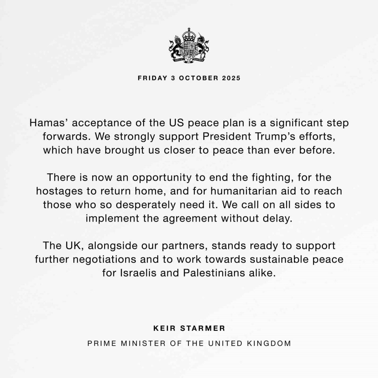 Starmer, yazılı olarak yaptığı açıklamada şunları belirtti: “Hamas’ın ABD barış planını kabul etmesi, önemli bir fırsat sunuyor. Başkan Trump’ın barışa ulaşma yönündeki çabalarını büyük bir destekle karşılıyoruz. Çatışmaların durması, rehinelerin ailelerine kavuşması ve insani yardımın ihtiyaç sahiplerine bir an önce ulaştırılması için şimdi ciddi bir fırsat mevcut. Tüm tarafları, bu anlaşmanın süratle uygulanmasını sağlamak için harekete geçmeye çağırıyoruz. İngiltere, uluslararası ortaklarıyla üzerinde durarak daha fazla müzakereyi desteklemeye ve hem İsrailli hem de Filistinli halklar için kalıcı bir barış sağlanması yönünde çalışmaya hazır” ifadelerini kullandı.