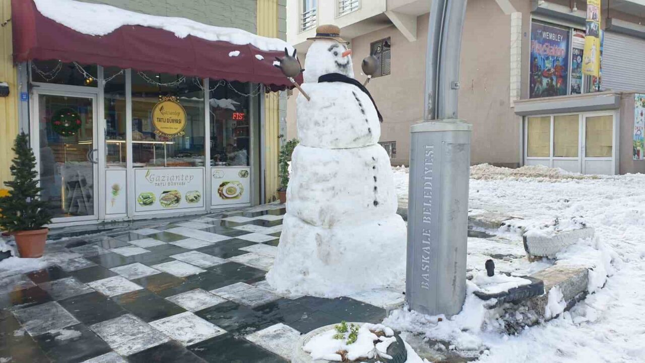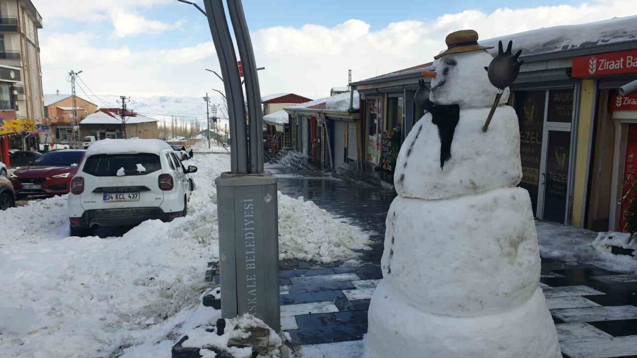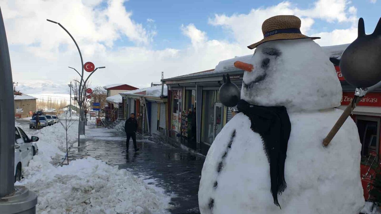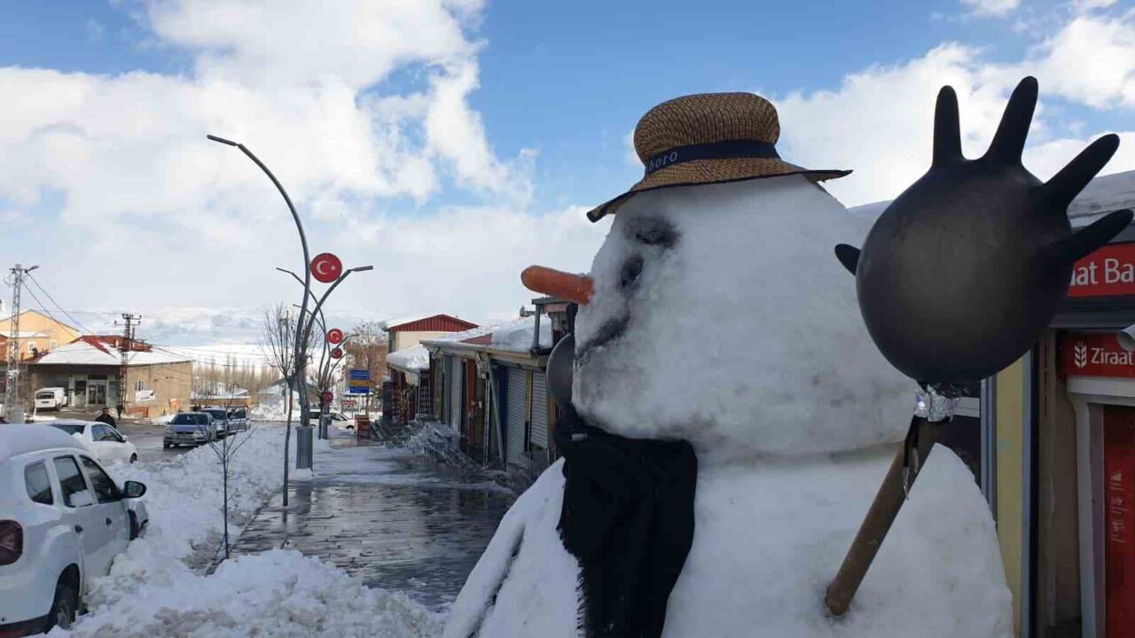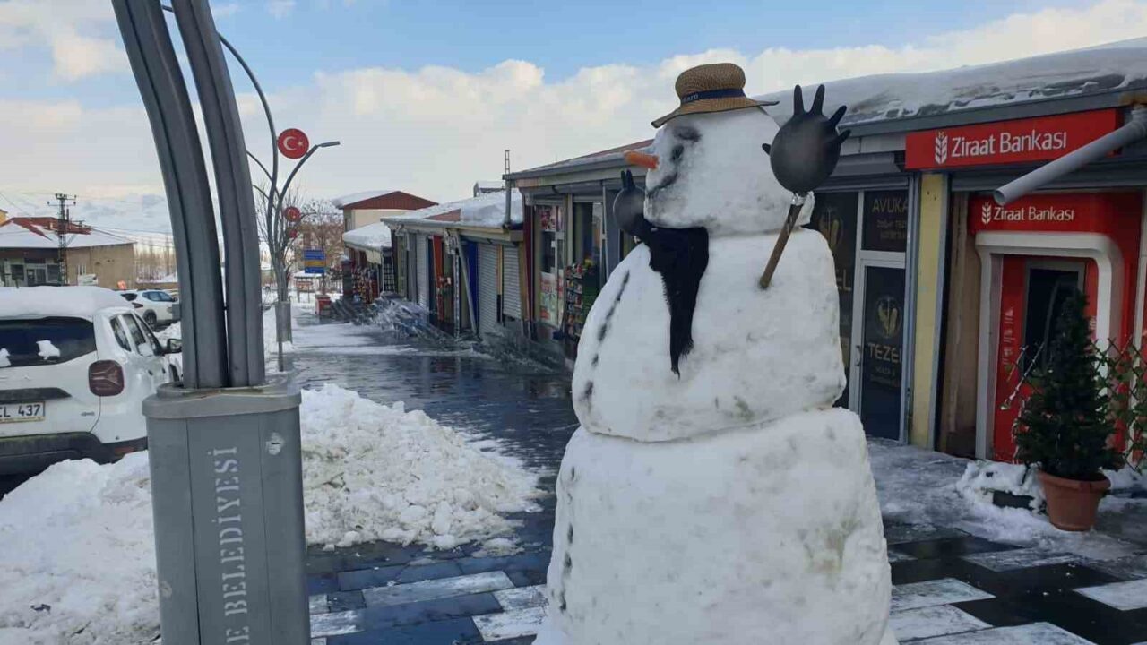 Van’ın Başkale ilçesinde kar yağışının etkisini kaybetmesinin ardından temizlik çalışmaları başlatıldı, fazla müşteri bulamayan esnaf ise kardan adam yaparak zaman geçirdi.
