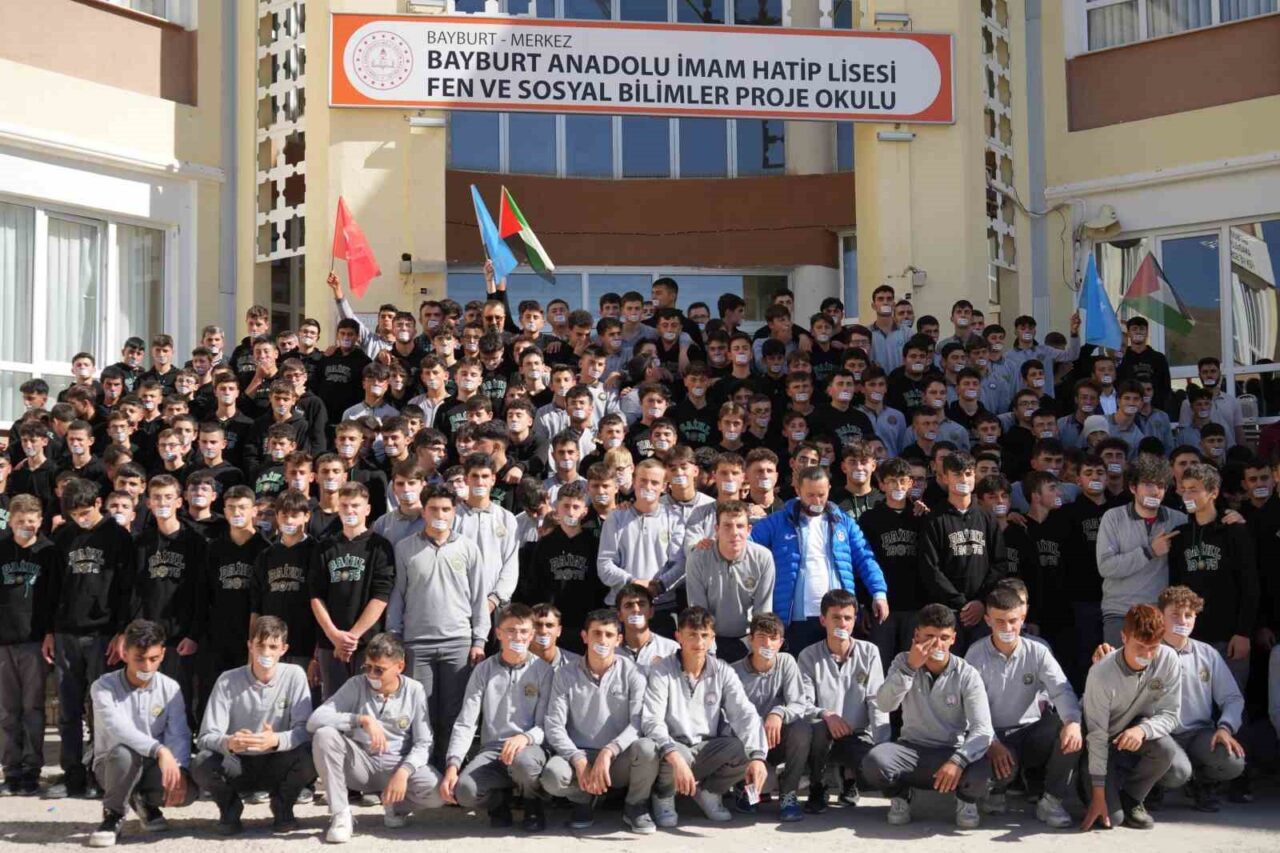 Bayburt İmam Hatip Lisesi Fen ve Sosyal Bilimler Proje Okulu, İsrail’in Gazze’ye yönelik saldırılarının ikinci yıldönümünde, Filistin’deki insani drama dikkat çekmek için “Söz tükendi: Nehirden denize özgür Filistin” temasıyla anlamlı bir sessiz protesto gerçekleştirdi.