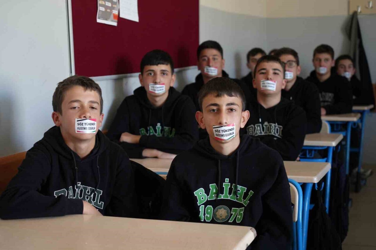 Etkinlikte öğrenciler, “Söz tükendi! ayağa kalk ey insan” yazılı bantlar ile ağızlarını kapatarak, İsrail’in Gazze’deki soykırımına karşı duruş sergiledi. Okul bahçesinde düzenlenen bu anlamlı etkinliğe, öğretmenler ve idareciler de katılım gösterdi.