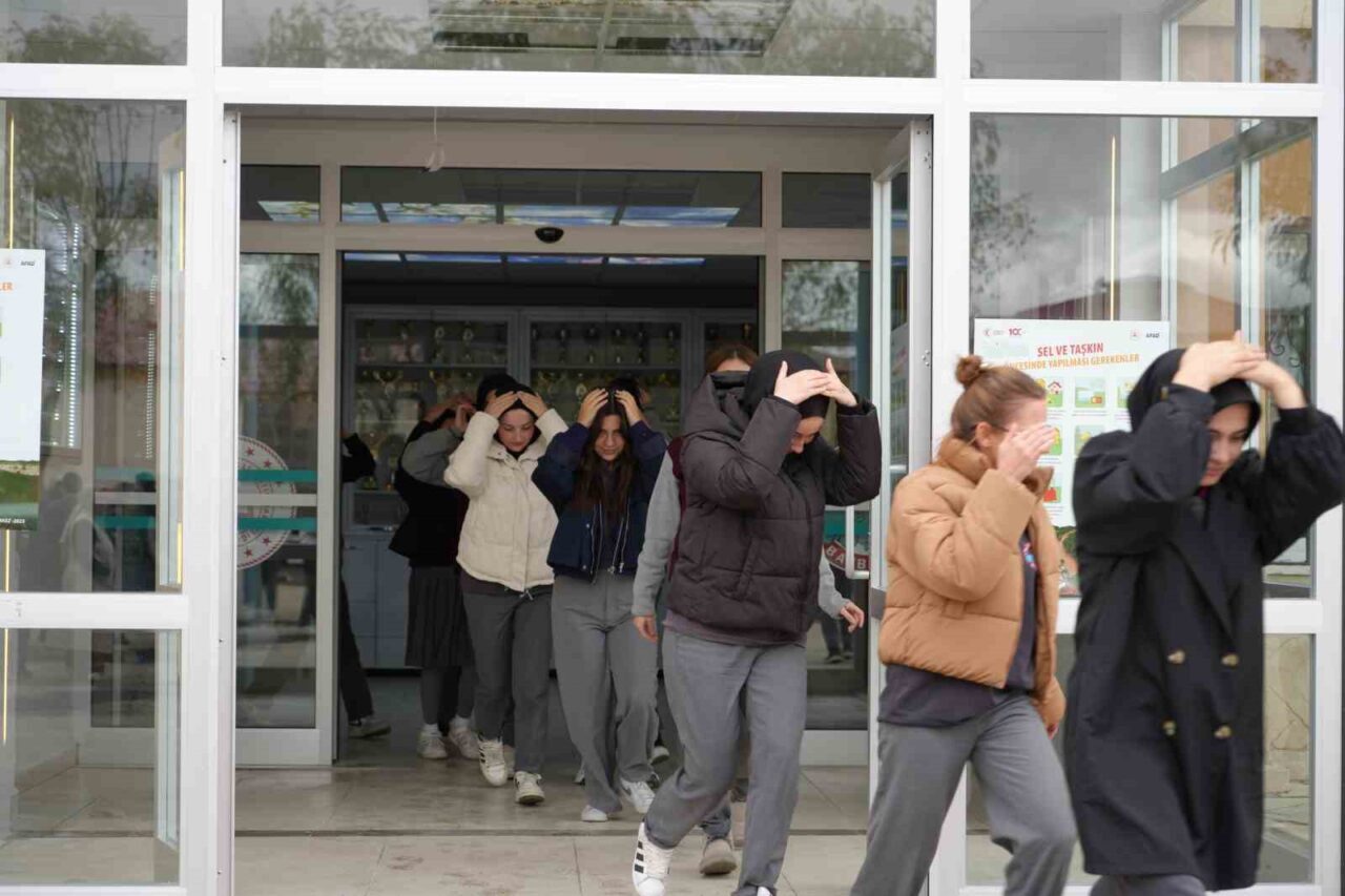 Tatbikatın teorik kısmının tamamlanmasının ardından, sirenlerin çalmasıyla öğrenciler öncelikle çök-kapan-tutun pozisyonunu alarak, depremin geçmesini beklediler. İkinci siren sesiyle sınıflar hızla tahliye edildi ve öğrenciler güvenli bir toplanma noktasına yönlendirilirken, senaryo gereği hafif yaralanan bir öğrenci de UMKE ekibi tarafından sedyeyle alındı. İlk yardım müdahalesi, ambulans ortamında gerçekleştirildi.