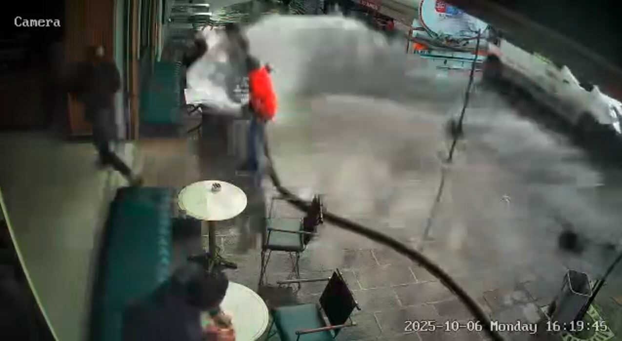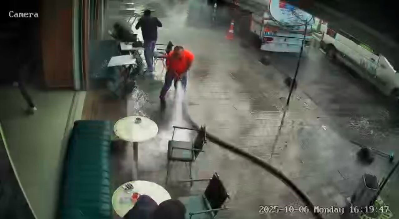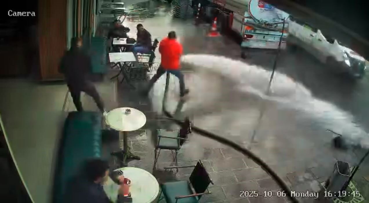 Olay, dün saat 16.00 civarında gerçekleşti. Kafe sahibi, iş yerinin önünü taze ve temiz görünmesi amacıyla tazyikli su ile yıkamaya girişti. Ancak tazyikli suyun etkisi altında kalan işletmeci, bir süre sonra hortumu kontrol edemedi ve sudan kaçmaya çalışan müşteriler, ne olduğunu anlamakta güçlük çekti. Herkesin şaşkın bakışları arasında, bu anlar güvenlik kameralarına yansıdı.