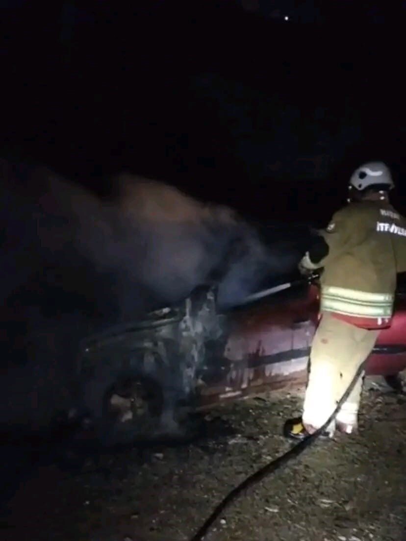 Hatay’ın Belen ilçesinde alevlere teslim olan otomobil, yanarak kullanılamaz hale geldi.