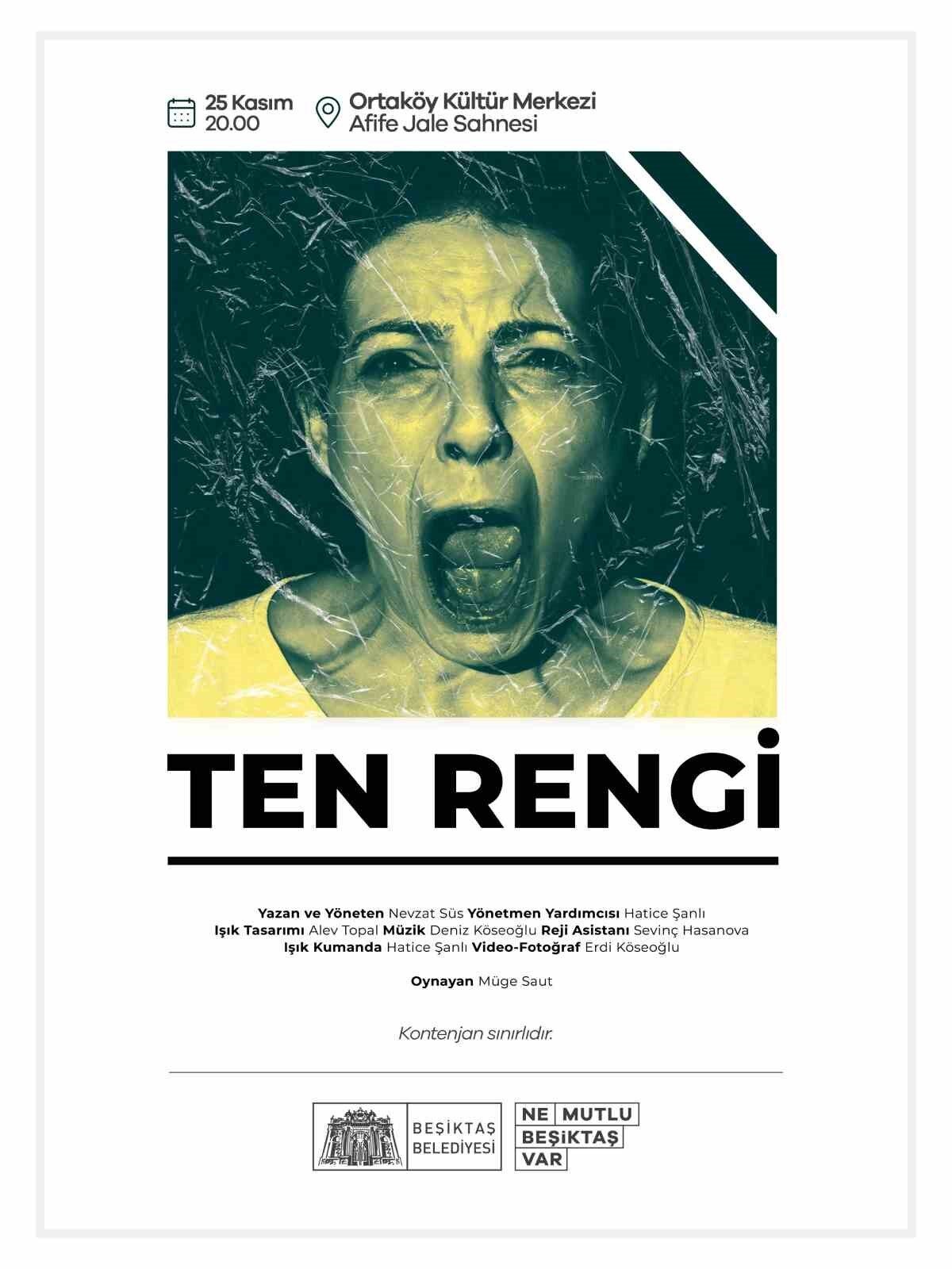 BEŞİKTAŞ BELEDİYESİ TARAFINDAN 25 KASIM KADINA YÖNELİK ŞİDDETE KARŞI ULUSLARARASI MÜCADELE GÜNÜ KAPSAMINDA BİR DİZİ ETKİNLİK DÜZENLENECEK. 22 KASIM’DA “DÜNDEN BUGÜNE KADINA YÖNELİK ŞİDDETLE MÜCADELE” PANELİYLE BAŞLAYACAK OLAN ETKİNLİKLER 25 KASIM’DA “TEN RENGİ” ADLI TİYATRO OYUNU GÖSTERİMİYLE SON BULACAK.