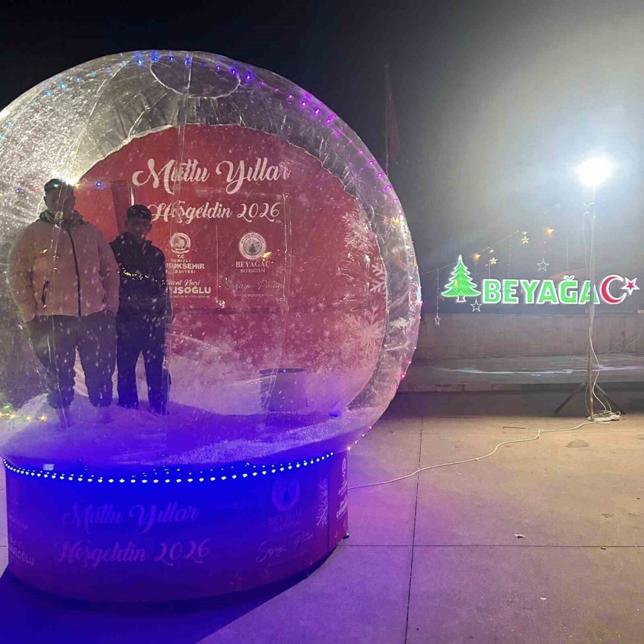 Denizli Büyükşehir Belediyesi ve Beyağaç Belediyesinin işbirliğiyle gerçekleştirilen uygulama kapsamında Beyağaç Çarşı Meydanına yerleştirilen dev kar küresi, içine giren vatandaşların fotoğraf çekilmesine olanak tanıyor. Beyağaçlı vatandaşlar, dev kar küresine yoğun ilgi gösteriyor.