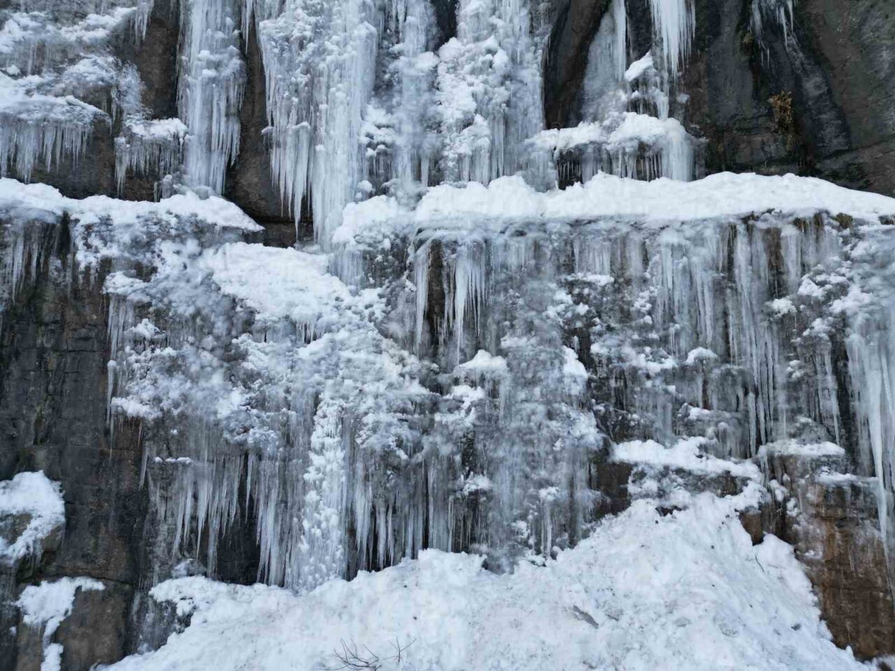 Şırnak’ın Beytüşşebap ilçesinde kar yağışı sonrası oluşan buz sarkıtları dronla görüntülendi