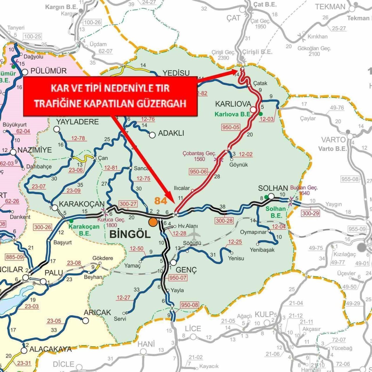 Bingöl Valiliği’nden yapılan açıklamada, “Bingöl-Erzurum Devlet Yolunun 0-88 km’leri arası (Kervansaray kavşağı ile Bingöl-Erzurum il sınırı arası) ve Bingöl-Diyarbakır devlet yolunun 0-31 km’leri arası (Genç ilçe girişi ile Diyarbakır il sınırı arası) yoğun kar yağışı ve tipi nedeniyle saat 20.30 itibarıyla TIR trafiğine kapatılmıştır” ifadelerine yer verildi.