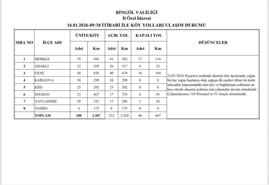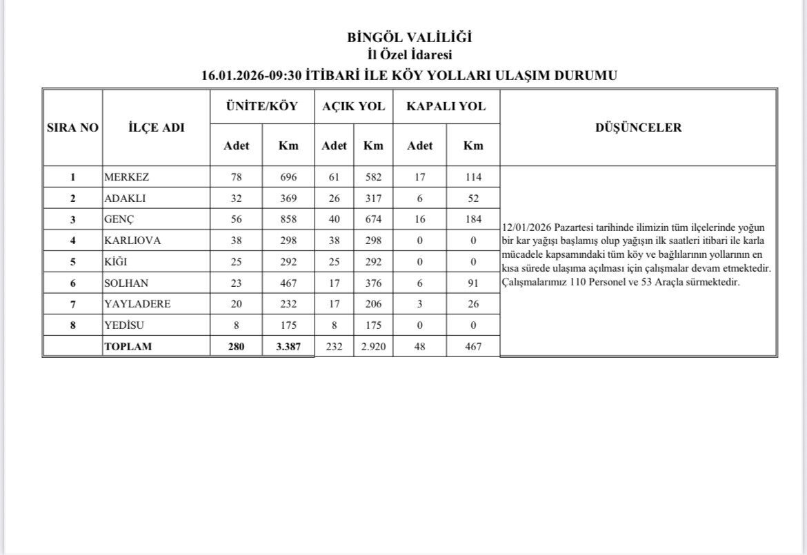 Bingöl’de etkili olan kar yağışı nedeniyle yüzlerce köy yolu ulaşıma kapandı. İl Özel İdaresi, 110 personel ve 53 araç ile çalışmalarını aralıksız olarak sürdürmekte. Yapılan çalışmalar sonucunda 280 köy yolundan 232’sinin ulaşıma açıldığı, 48 köy yolunda ise çalışmaların devam ettiği bildirildi.
