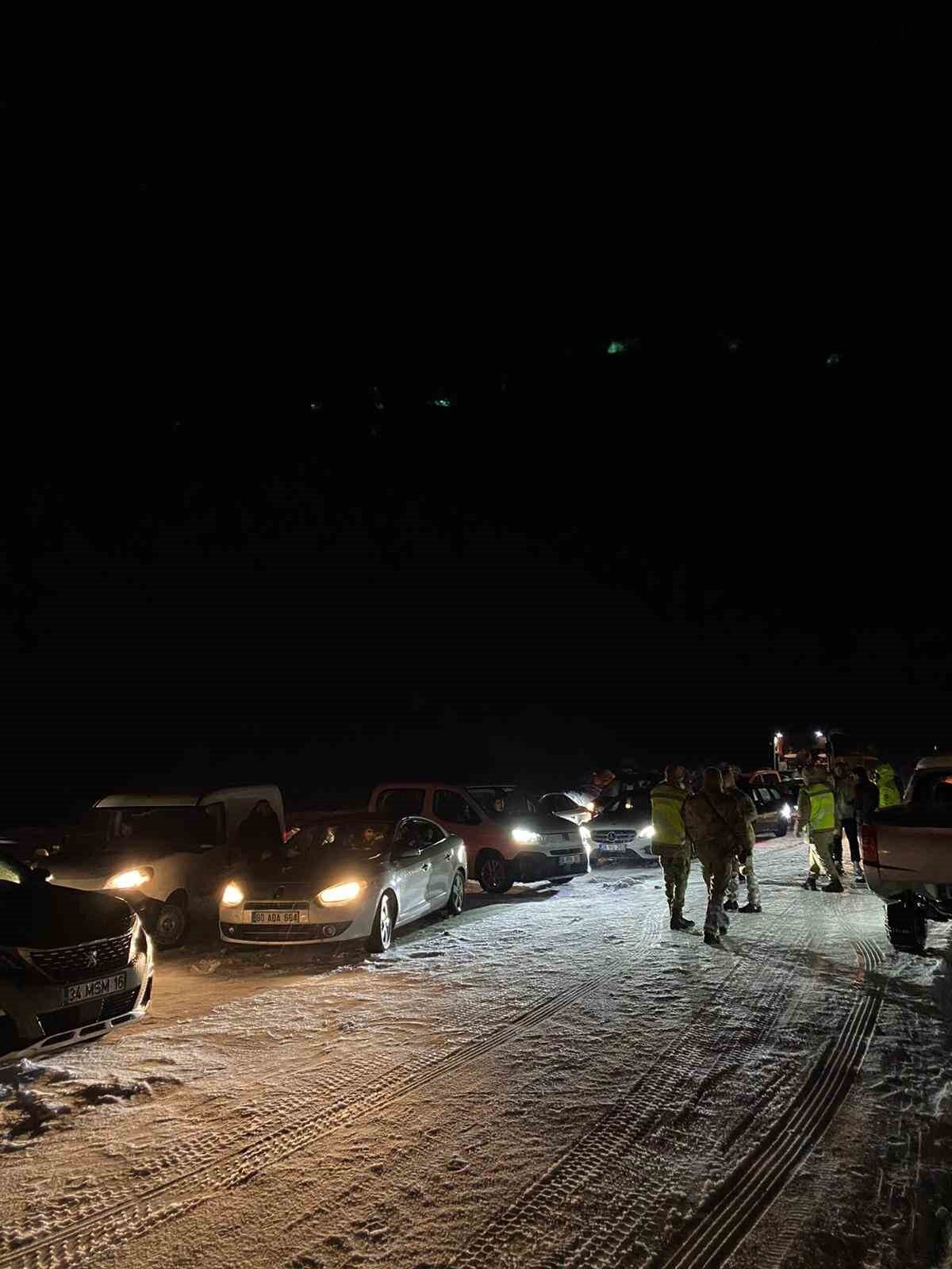 Bitlis’teki etkili yoğun kar yağışı sonucu Bitlis-Baykan karayolu üzerindeki Bitlis Çayı Viyadüğü’nde saat 19.30 civarında bir tır kaydı. Kayan tır dolayısıyla trafikte uzun araç kuyrukları meydana gelirken, Karınca köyü mevkiinde birçok vatandaş yolda mahsur kaldı. İhbar üzerine bölgeye karayolları ekipleri sevk edildi ve AFAD İl Müdürlüğü ile koordinasyon içinde Türk Kızılay Bitlis İl Merkezi Başkanlığı tarafından saat 19.30’da destek çalışmaları başlatıldı. Kızılay personeli ve gönüllüler, yolda mahsur kalan vatandaşlara kek, meyve suyu ve su ikram etti. Yaklaşık 3 saat süren çalışmaların sonucunda yol kontrollü bir şekilde trafiğe açılırken, zorlu hava şartları nedeniyle bölgede mağdur olan vatandaşların temel ihtiyaçları karşılandı. Ulaşım ekiplerin yönlendirmesiyle sağlanıyor.