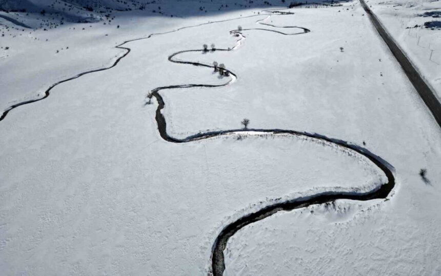 Bitlis’in Tatvan ile Hizan ilçelerini birbirine bağlayan kara yolu üzerinde yer alan Güzeldere menderesleri, etkili olan kar yağışıyla birlikte adeta kartpostallık manzaralara sahne oldu.
