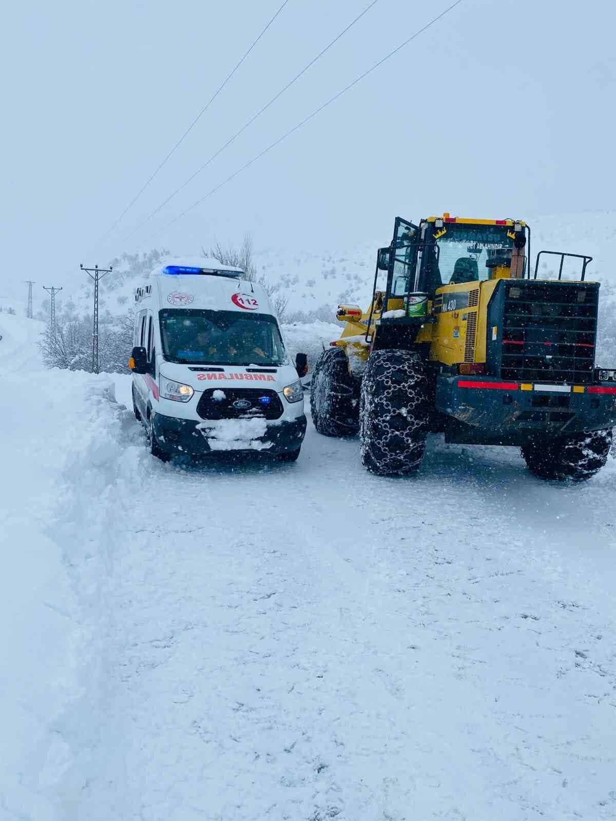 Yoğun kar yağışı ile zorlu yol ve hava koşullarına rağmen ekipler, kapanan yolu kısa sürede ulaşıma açarak sağlık ekiplerinin köye güvenli bir şekilde ulaşmasını sağladı.