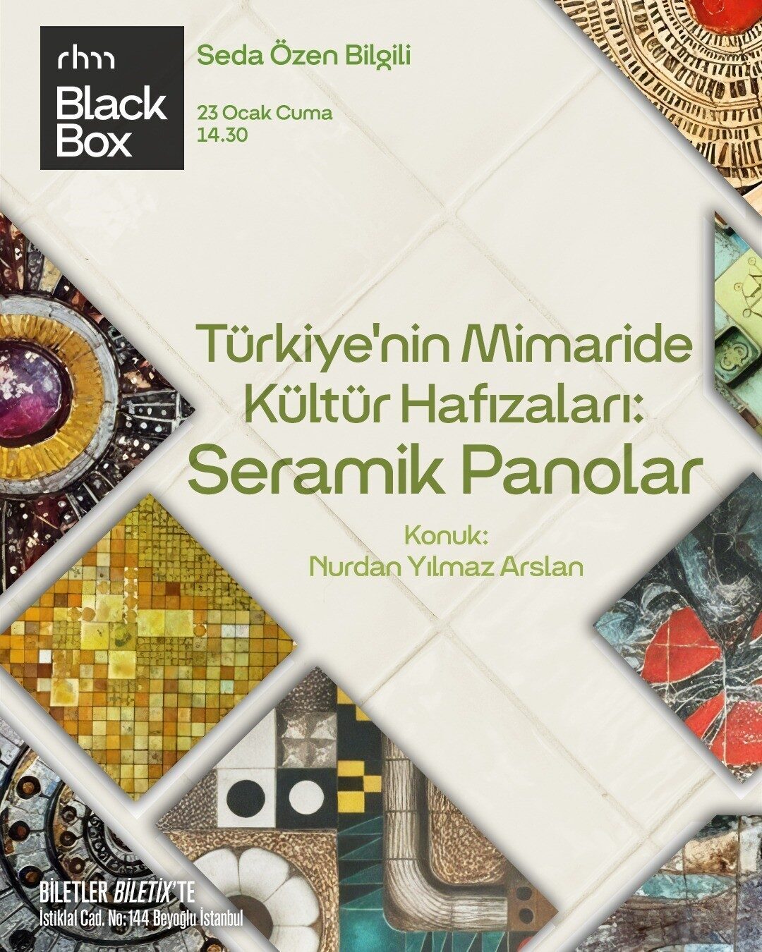 BlackBox’ın ocak ayındaki konuklarından biri de Türkiye’nin Mimaride Kültür Hafızaları: Seramik Panolar kitabının yazarı Nurdan Yılmaz Arslan olacak. Moderatörlüğünü mimar Seda Özen Bilgili’nin üstleneceği söyleşide, kamusal yapılarda yer alan ve mimariyle bütünleşen seramik panoların toplumun tarihsel ve estetik hafızasındaki yeri ele alınacak.