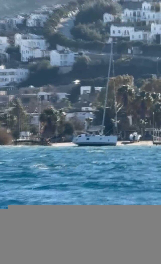 Muğla’nın Bodrum ilçesinde şiddetli rüzgar ve dalgalar denizde olumsuzluklara yol açarken, yelkenli tekne karaya oturdu.