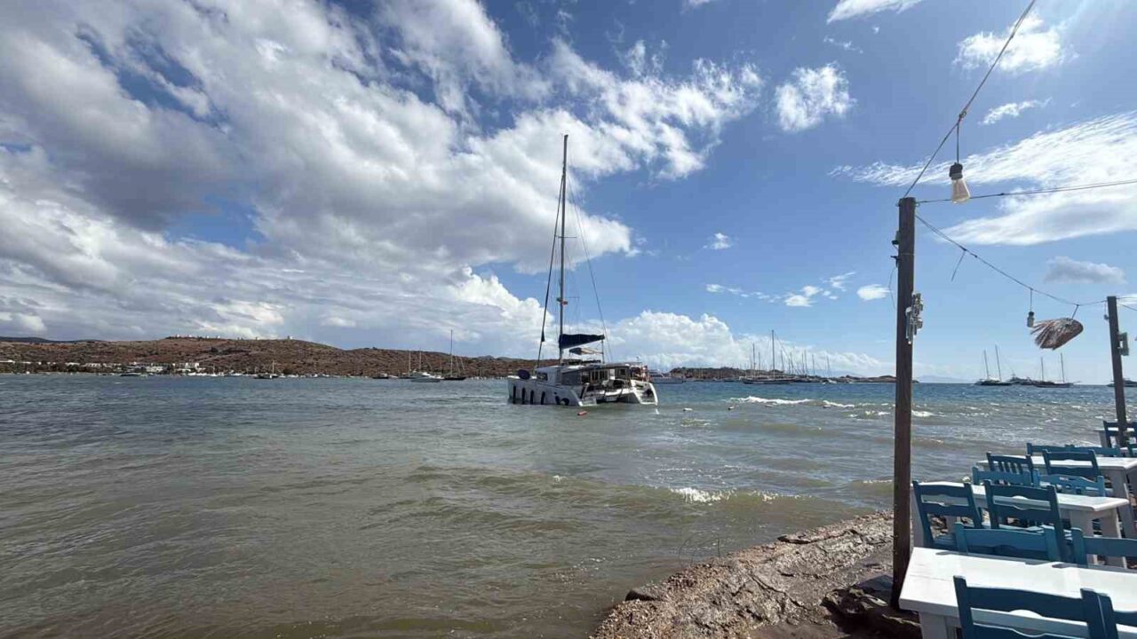 Muğla ilinin Bodrum ilçesinde yoğun rüzgarın etkisiyle bir katamaran tipi yelkenli tekne, sahile sürüklendi.