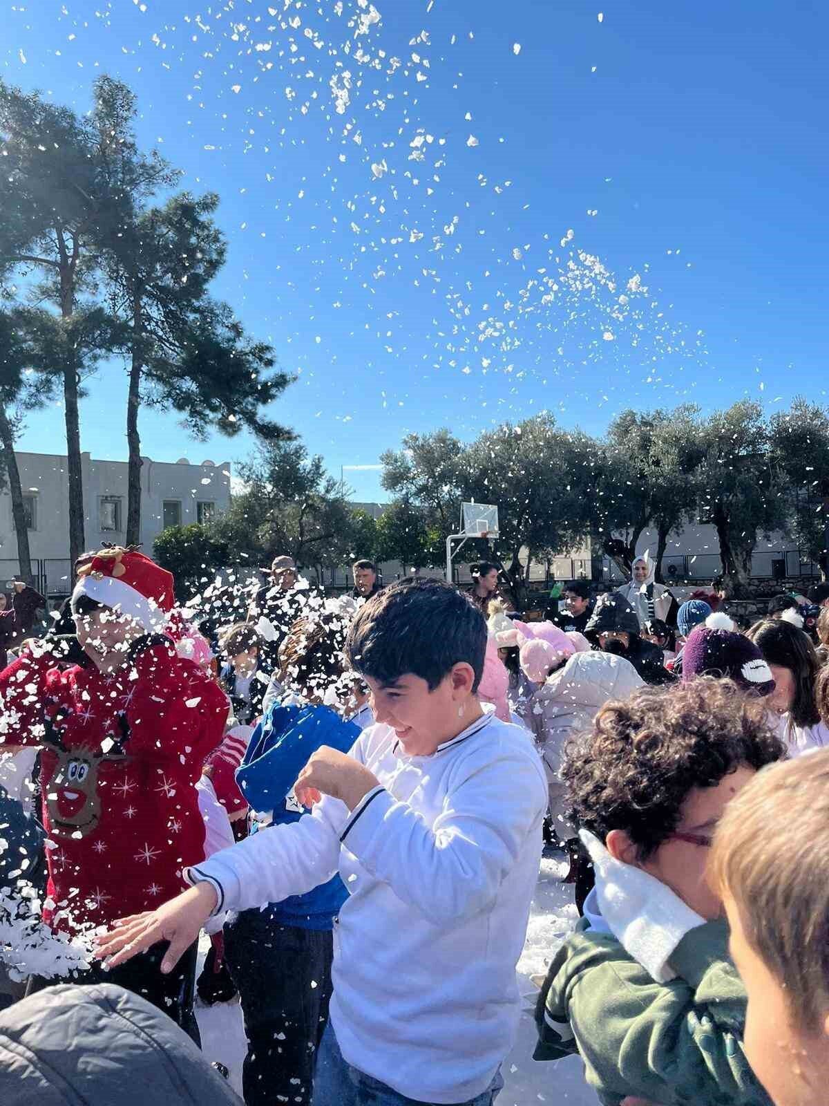 Bodrum’daki ilkokulda yeni yıl etkinliğinde yapay kar ile çocuklar eğlendi.