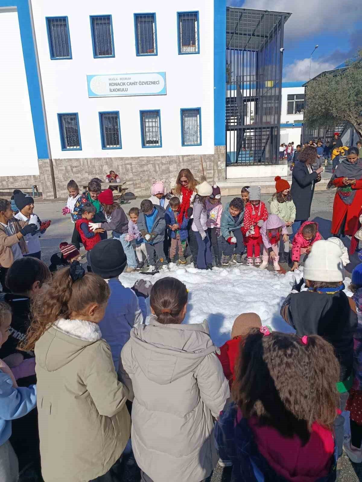 Muğla’nın Bodrum ilçesinde bir ilkokula getirilen yapay kar ile çocuklar gönüllerince eğlendi.