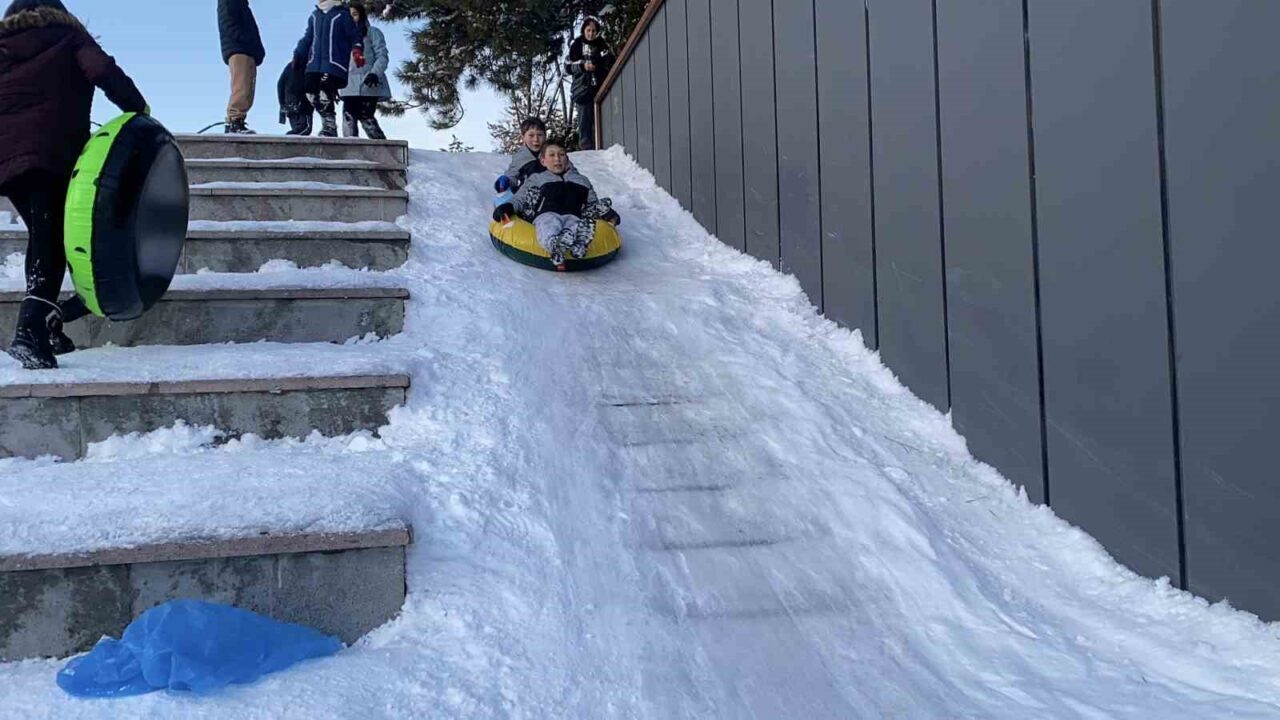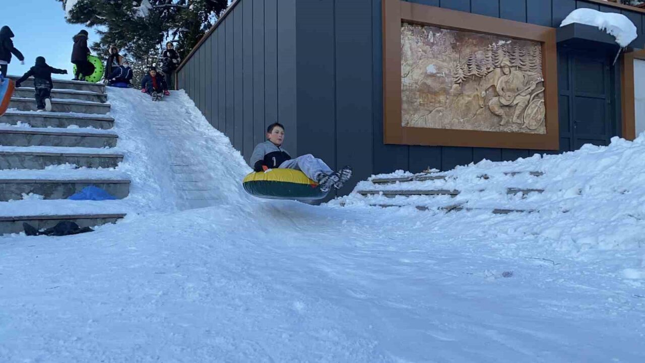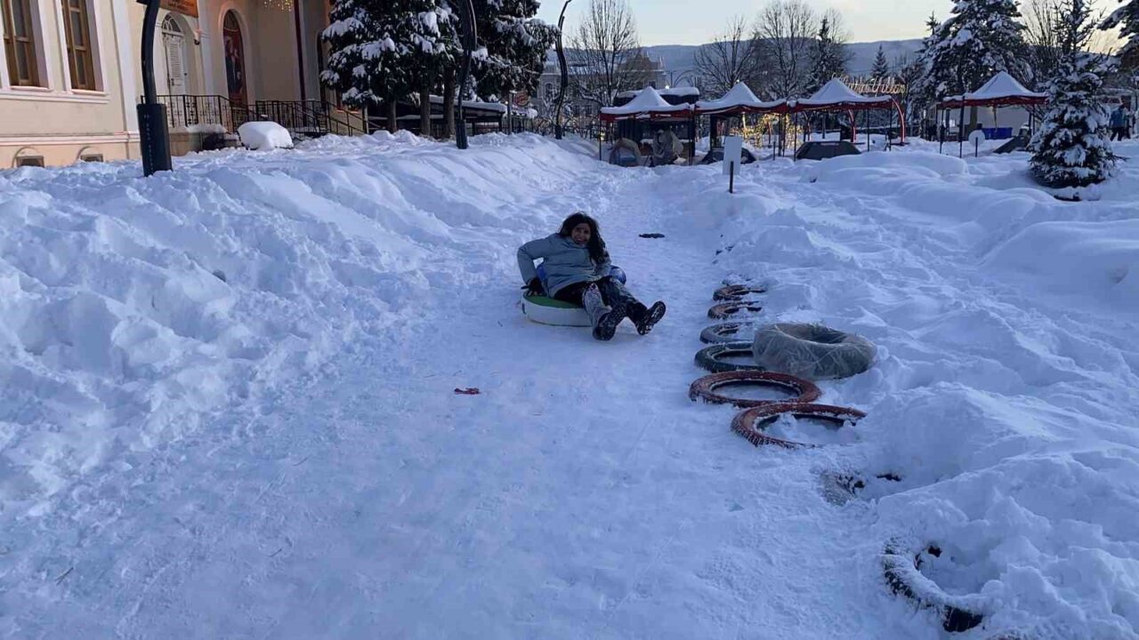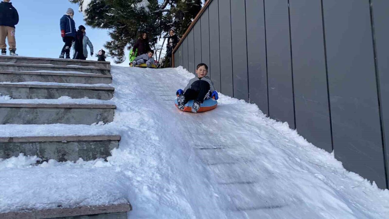 Bolu’da hafta boyunca etkili olan kar yağışı nedeniyle kar kalınlığı şehir merkezinde 65 santimetreyi aştı. 1 Ocak resmi tatil hariç, hafta boyunca diğer günlerde Bolu Valiliği tarafından okullar tatil edildi. Okulların tatil olmasını ve kar yağışını fırsat bilen çocuklar, şehrin birçok bölgesini kayak pistine dönüştürdü. Ellerine şambrel, poşet ve kızaklarını alan minikler, tepe noktalarda kayarak karın tadını çıkardı. İzzet Baysal Caddesi Kent Meydanı’nda merdivenleri kaplayan kar nedeniyle rampayı kayak pisti gibi kullanan çocuklar, doyasıya eğlendi.