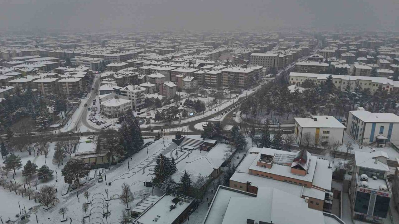 Bolu’da şehir merkezinde aralıklarla kar yağışı etkisini gösterirken, beyaz örtüyle kaplanan kent merkezi havadan görüntülendi.