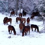 Bolu’da karlı havada yiyecek bulmakta zorlanan yılkı atları şehir merkezine indi