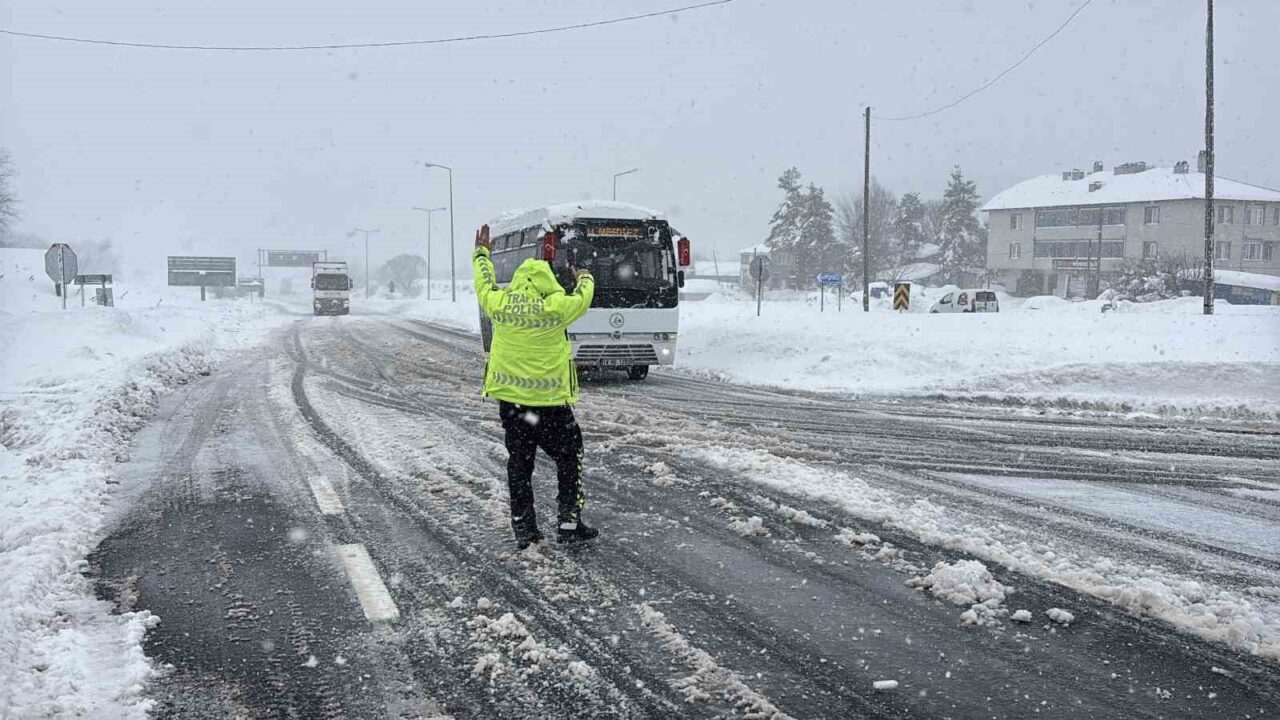 Bolu’da gün boyu aralıklarla süren ve öğle saatlerinde yoğunlaşan kar yağışı, ulaşımda aksamalara yol açtı. Özellikle Türkiye’nin önemli geçiş güzergahlarından biri olan D-100 kara yolunun Bolu Dağı kesiminde yoğun kar yağışı ve olası buzlanma riski nedeniyle tedbirler artırıldı. Kar yağışının şiddetinin artmasının ardından harekete geçen İl Emniyet Müdürlüğü trafik ekipleri, D-100 kara yolunun İstanbul istikametinde tır ve kamyon geçişlerine izin vermedi. Elmalık Kavşağı mevkiinde bir kontrol noktası oluşturan ekipler, ağır tonajlı araçların D-100 kara yolunu kullanmalarına müsaade etmiyor. Sürücüler, polis ekipleri tarafından TEM Otoyolu’na yönlendiriliyor.