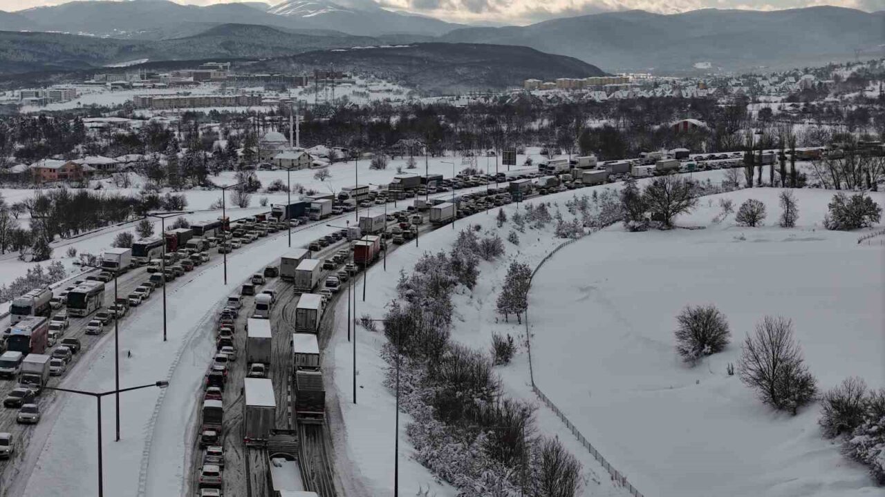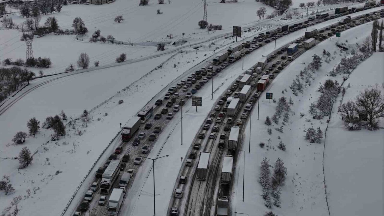 Ankara ve İstanbul istikametinde trafik tamamen kilitlenirken, yolda kalan yüzlerce araç havadan görüntülendi.