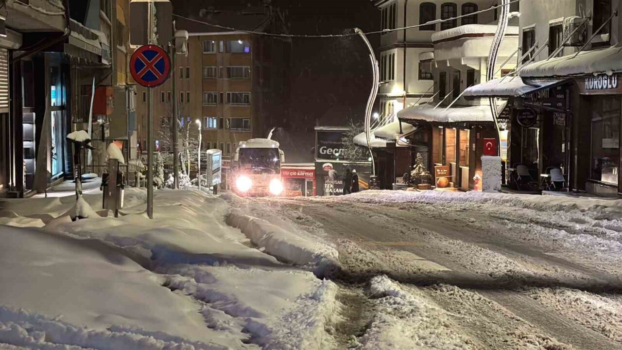 **Bolu’da etkisini artıran yoğun kar yağışı, kent merkezinde hayatı felç etti.** Kar kalınlığının 30 santimetreyi aştığı şehirde, ana arterlerdeki dik rampalarda birçok araç yolda kaldı. Üniversite seferini yapan bir halk otobüsü yokuşu çıkamayarak geri dönmek zorunda kaldı.