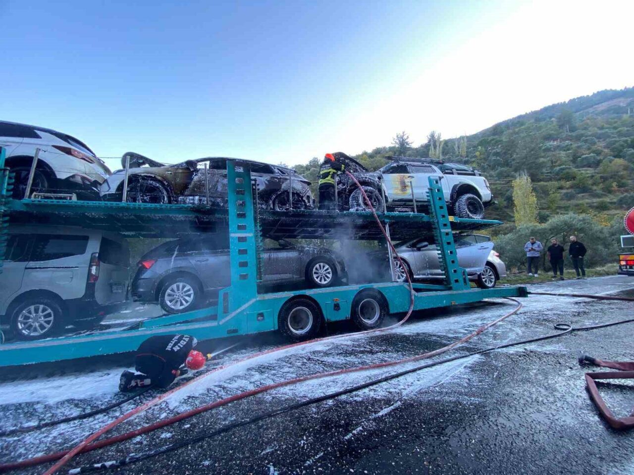 İhbar üzerine, olay yerine hemen itfaiye ekipleri yönlendirildi. Kısa sürede gelen ekipler, yangına müdahale ederek söndürmeyi başardı. Yangının soğutma çalışmaları sürerken, tırda yüklü bulunan araçların büyük zarar gördüğü belirtildi. İlk incelemelere göre yangının, tırın fren balatalarından kaynaklandığı düşünülüyor. Ancak, kesin nedenin belirlenmesi amacıyla detaylı inceleme çalışmaları devam ediyor.