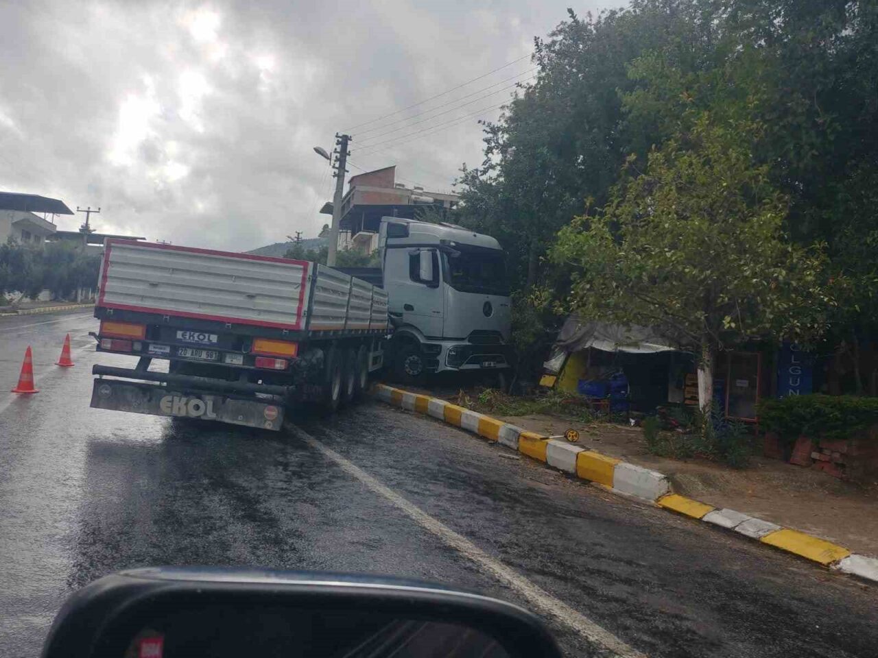 Aydın’ın Bozdoğan ilçesinde, öğle saatlerinde yaşanan bir trafik kazasında sürücüsünün kontrolünü kaybettiği tır, yoldan çıkarak kaldırıma çıktığı ve etrafındaki ağaçları devirdiği bildirildi.