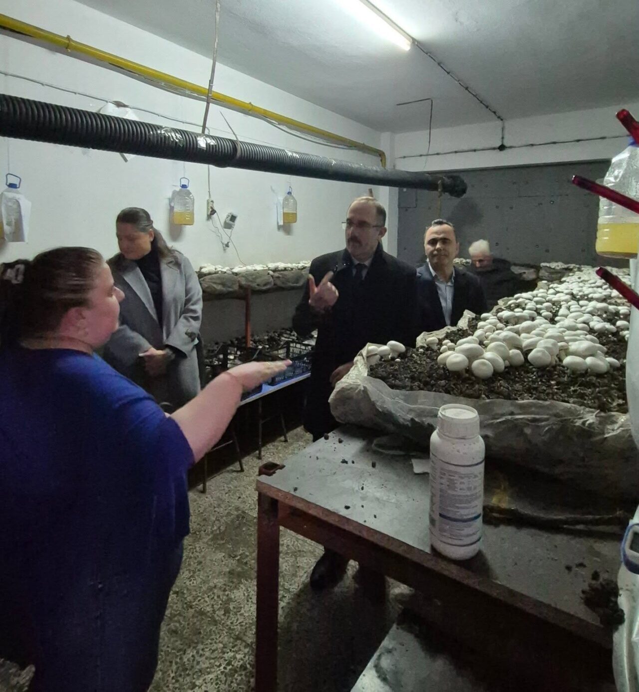 Hasat programına katılan İlçe Millî Eğitim Müdürü Şenel Bulut, mantar üretim alanında incelemelerde bulunarak yürütülen çalışmalar hakkında okul idarecileri ve öğretmenlerden detaylı bilgi aldı.