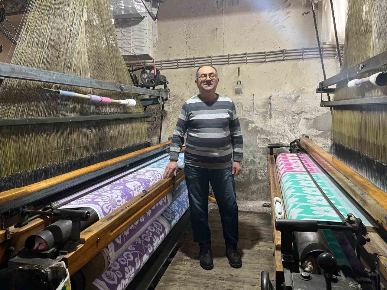 Denizli’nin Buldan ilçesinde, teknolojik gelişmelerle birlikte sayılarının azalmasına rağmen kara tezgâhlarda havlu üretimi devam etmekte. Elektriğin Buldan’a ulaşmasıyla el tezgâhlarından motorlu kara tezgâhlara geçilen dokumacılık, ilerleyen yıllarda otomatik tezgâhların yaygınlaşmasıyla büyük ölçüde değişim geçirdi. Daha fazla ve hızlı üretim yapmak isteyen birçok dokumacı, kara tezgâhlarını hurdacılara satarak modern makinelere yöneldi. Ancak Buldan’da, sayıları az da olsa jakarlı kara tezgâhlarda üretim yapmakta ısrar eden dokumacılar mevcut. Bunlardan biri olan 61 yaşındaki Mehmet Sağlık, baba mesleğini yaşatmaya kararlı olduğunu ifade etti. Küçük yaşlardan itibaren dokumacılığın içinde büyüdüğünü belirten Sağlık, “İlkokula giderken masır ve bobin sararak aileme yardım ediyordum. İlkokulu bitirdikten sonra yavaş yavaş tezgâhların başına geçtim. Yıllardır bu mesleği sürdürüyorum. Ailemi bu meslek sayesinde geçindirdim, çocuklarımı büyüttüm ve okuttum” dedi.