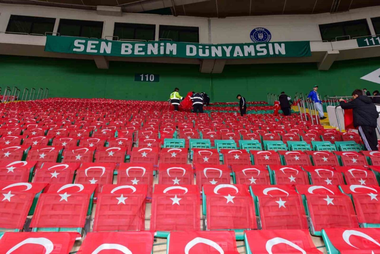 Dağıtılan bayraklarla stadyum adeta kırmızı-beyaza bürünürken, Bursasporlu taraftarların elinde yükselen 40 bin Türk bayrağı, tribünlerde görsel bir şölen oluşturdu. Vatandaşlar, milli değerlere sahip çıkmanın gururunu hep birlikte yaşadı.