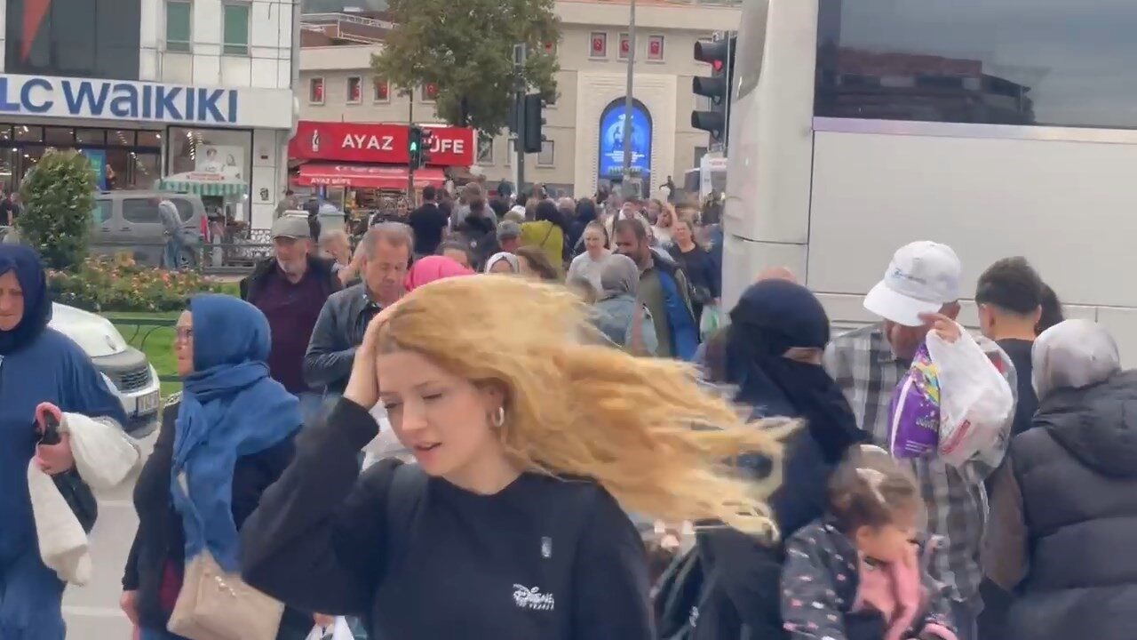 Bir vatandaş, annesiyle birlikte rüzgardan korunarak ilerlemeye çalışırken çevredeki insanların yardımıyla yolun karşısına geçmeyi başardı. Hava şartlarının beklenenden daha etkili olduğu bu durum, Bursalılara zor anlar yaşattı.