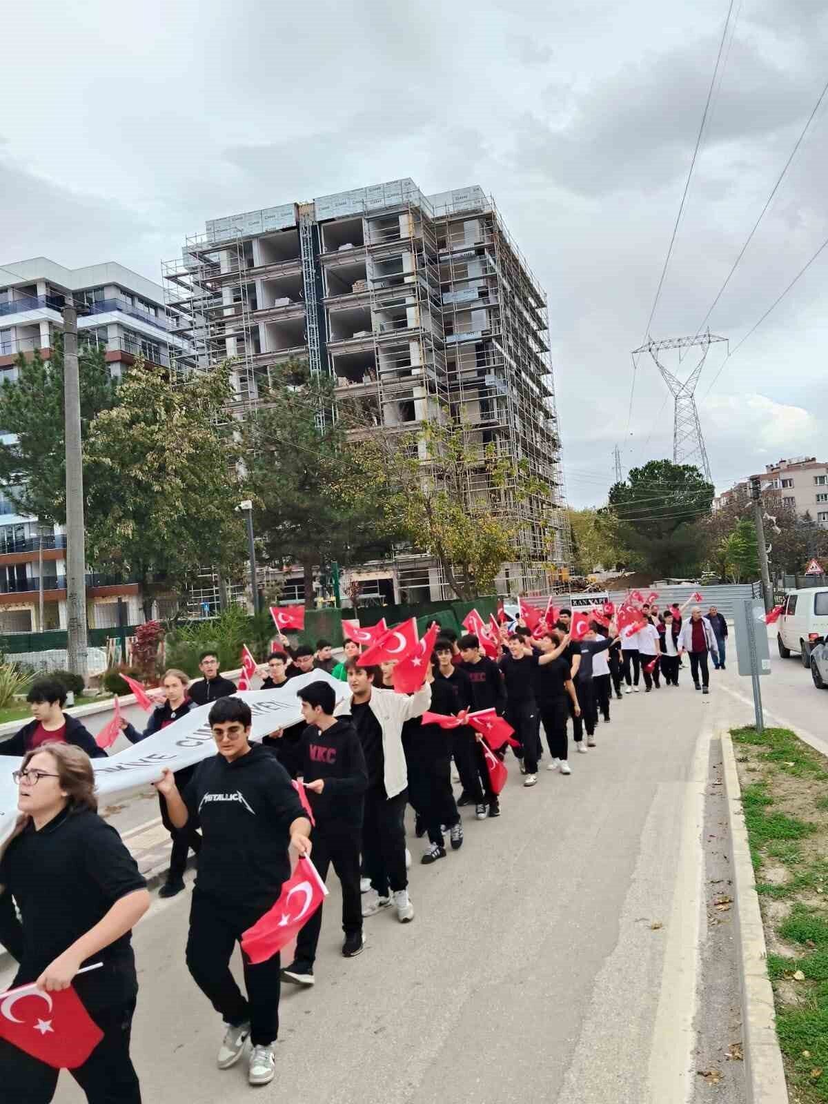 Daha sonra, öğrenci ve öğretmenler, Nilüfer İlçe Emniyet Müdürlüğü’nün desteklediği bir yürüyüş düzenleyerek okul çevresini terk ettiler. Ellerinde Türk bayraklarıyla yürüyüşe katılan gençler, yolda karşılaştıkları vatandaşlara ve esnafa karanfiller dağıtarak Cumhuriyet Bayramı’nın coşkusunu paylaştı. Yaklaşık 30 dakika süren yürüyüş, çevre halkı tarafından büyük bir ilgi ve coşkuyla karşılandı.
