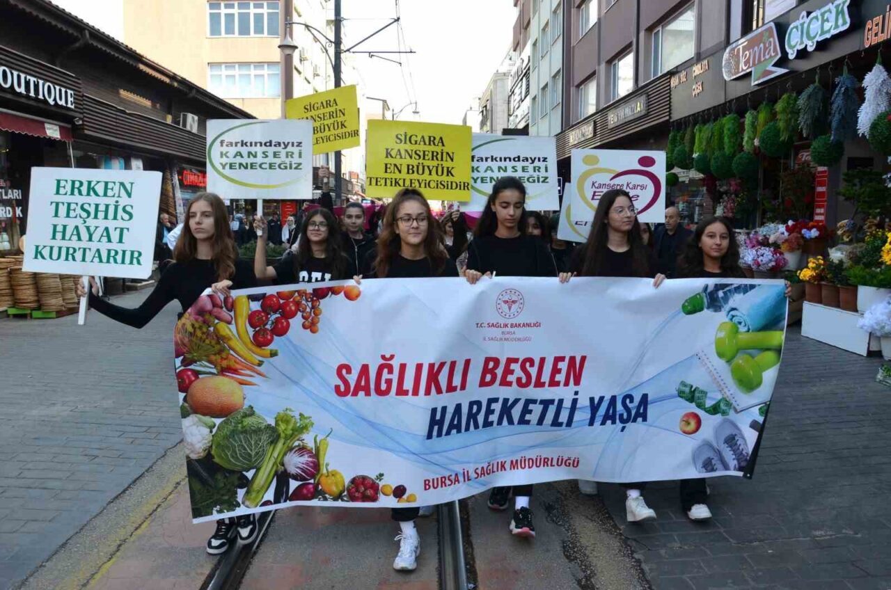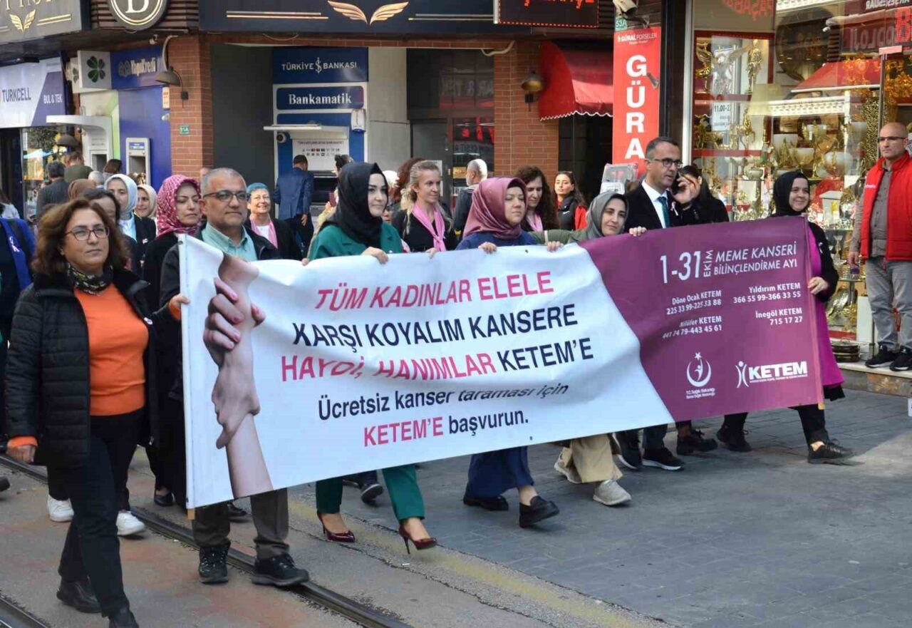 Sağlık Bakanlığı’nın ülke genelinde gerçekleştirdiği 1-31 Ekim Meme Kanseri Farkındalık Ayı kapsamında, yoğun katılım ile düzenlenen yürüyüş, Cumhuriyet Caddesi’nden Zafer Meydanı’na doğru ilerledi. Bursa Büyükşehir Belediyesi Bandosu da marşlarıyla etkinliğe destek vererek katılan kalabalık gruba eşlik etti. Yürüyüşe; İl Sağlık Müdürlüğü Halk Sağlığı Hizmetleri Başkanı Dr. İrfan Oğuz, Kamu Hastaneleri Başkanı Dr. Melike Savaş, sağlık çalışanları, sivil toplum temsilcileri, kanser dernekleri ve öğrenciler katıldı. Ayrıca, lise öğrencileri ellerinde taşıdıkları dev ‘pembe kurdeleler’ ile yürüyüşe renk kattı.