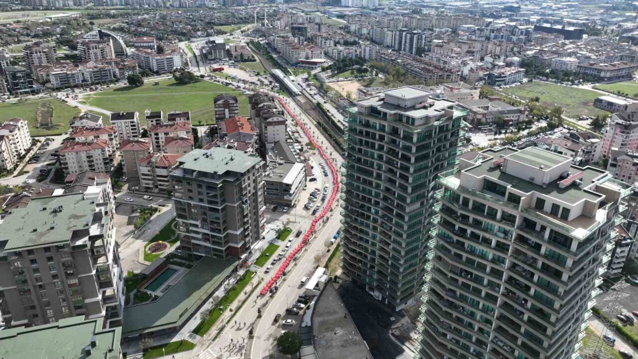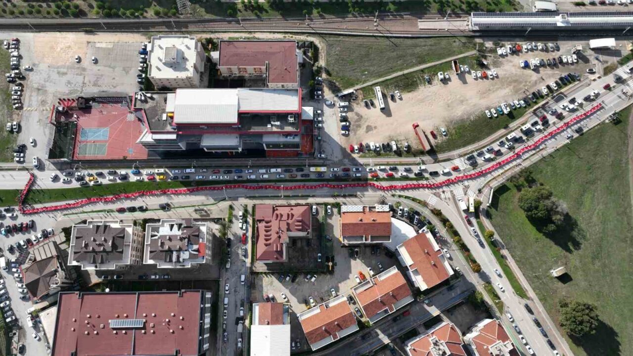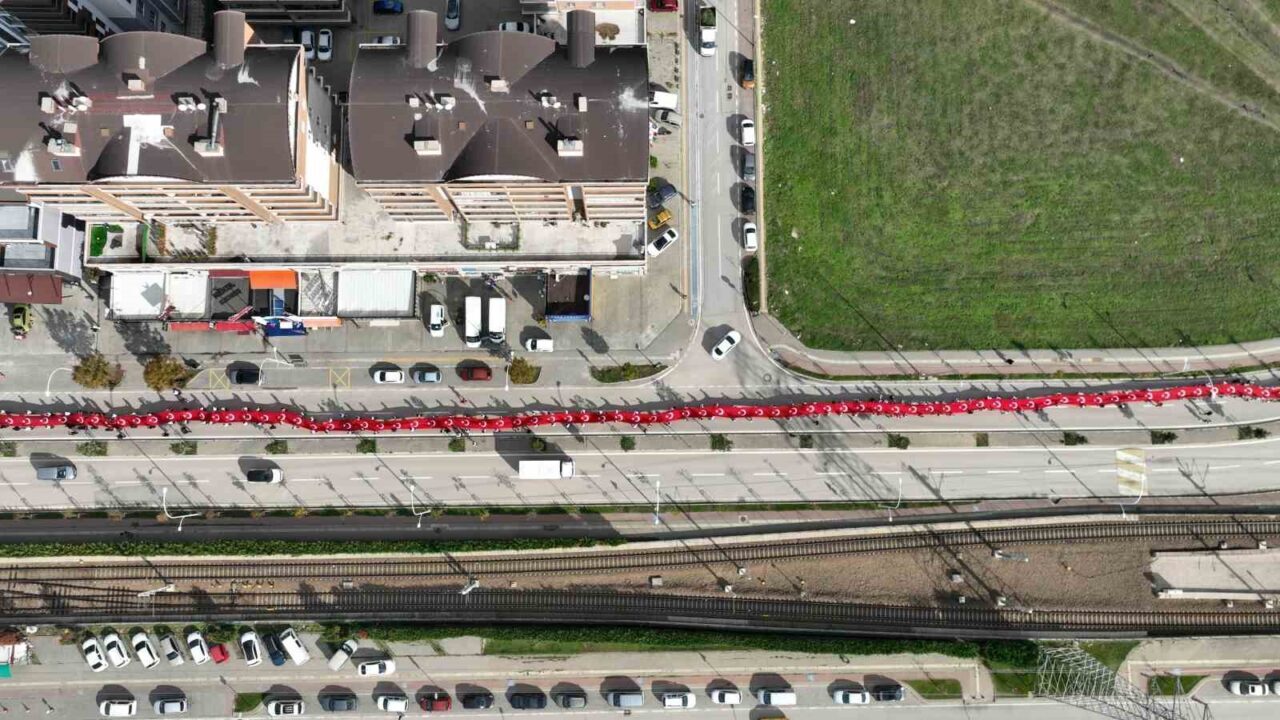 Cumhuriyet Bayramı hazırlıkları kapsamında, Bursa’nın Nilüfer ilçesinde düzenlenen bayrak yürüyüşüne ilkokul, ortaokul ve lise öğrencileri katıldı. Uzun bayrak, caddenin tamamını kaplayacak şekilde açıldı. Öğrenciler, okullarından çıkarken 500 metrelik bayrağı coşkuyla taşıdı. BURSARAY istasyonu önünden geçen bayrağın, hareket halindeki bir trenle yan yana gelmesi anı da drone ile havadan kaydedildi. Yüksek binaların arasındaki bu eşsiz görüntü, kutlama boyunca renkli manzaralar sundu.