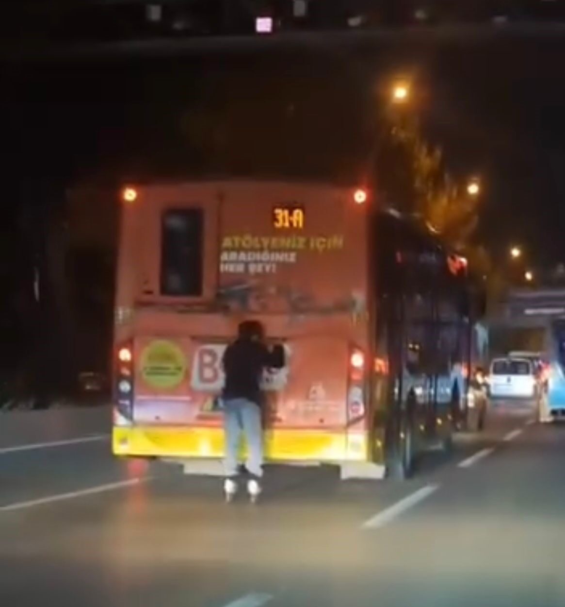 Bursa’nın merkez Osmangazi ilçesinde, tehlikeli bir olay yaşandı. Paten kayarak bir otobüsün arkasına tutunan genç, trafikte büyük bir tehlike oluşturdu. O anlar, o sırada tanık olan bir vatandaş tarafından kaydedildi.