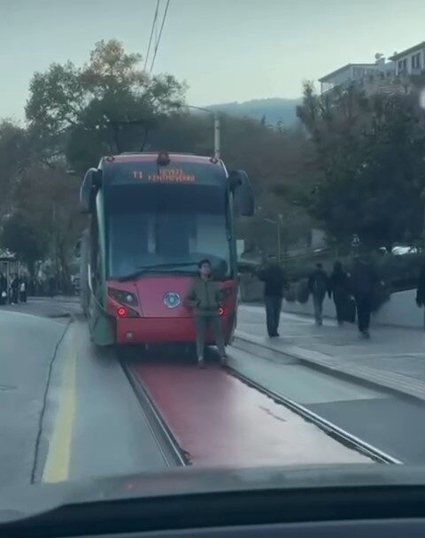 Bursa’nın Osmangazi ilçesinde, hareket halindeki tramvayın arkasında oturan bir çocuk, çevredeki vatandaşları şaşkınlığa uğrattı. Bu tehlikeli yolculuk, izleyenlerin yüreklerini ağızlarına getirdi.