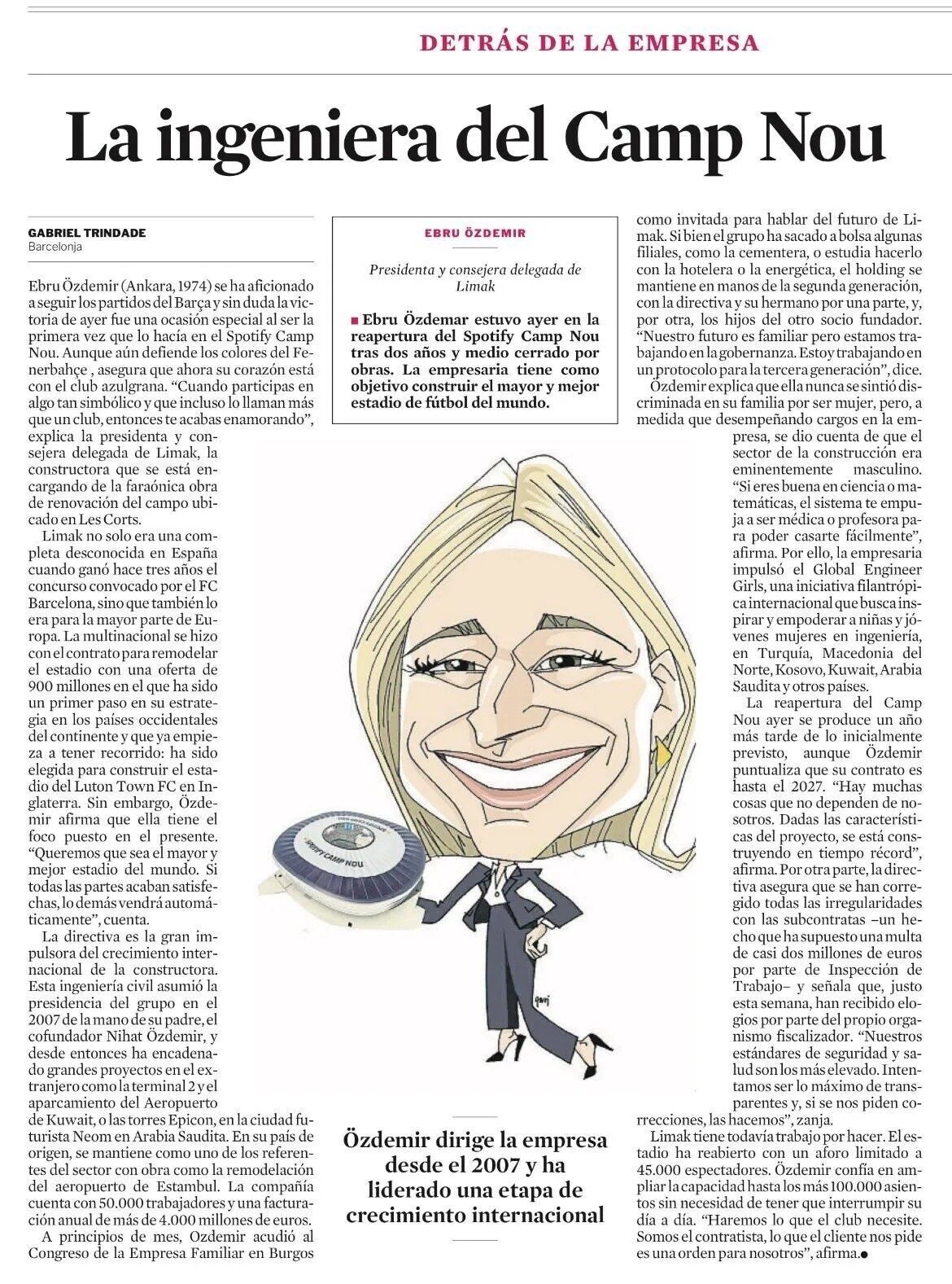 LİMAK HOLDİNG YÖNETİM KURULU BAŞKANI EBRU ÖZDEMİR, İSPANYA’NIN KÖKLÜ GAZETESİ LA VANGUARDİA’YA VERDİĞİ RÖPORTAJDA, SPOTİFY CAMP NOU’NUN YENİLEME ÇALIŞMALARINA İLİŞKİN ÖNEMLİ DEĞERLENDİRMELERDE BULUNDU.