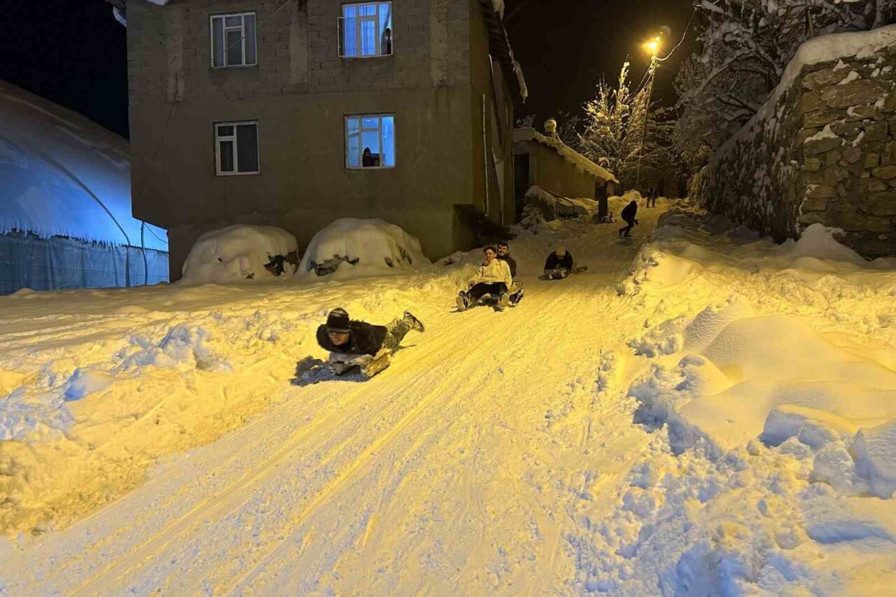 Van’ın Çatak ilçesinde yoğun kar yağışı nedeniyle okulların il genelinde tatil edilmesini fırsata çeviren öğrenciler, kızaklarıyla gece geç saatlere kadar kayarak karın tadını çıkardılar.