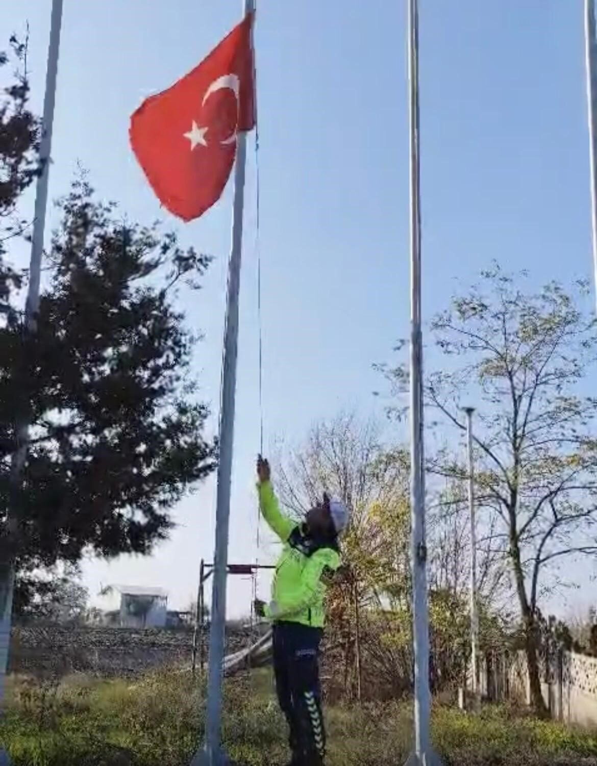 BAYRAĞIN SOLMUŞ OLDUĞUNU GÖREN EKİPLER, ARAÇLARINDA HAZIR BULUNDURDUKLARI YENİ TÜRK BAYRAĞINI ALARAK ESKİ BAYRAKLA DEĞİŞTİRDİ.