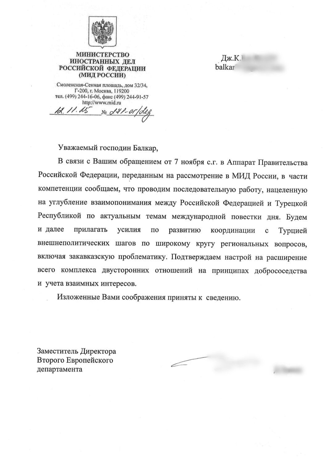 BALKAR, ZAHAROVA’NIN SÖZLERİNİN HEM TARİHSEL OLARAK YANLIŞ OLDUĞUNU HEM DE TÜRK-RUS İLİŞKİLERİNE ZARAR VEREBİLECEĞİNİ BELİRTEREK KREMLİN’E BİR YAZI GÖNDERDİ. RUS MAKAMLARI İSE YAZIYA KISA SÜREDE DÖNÜŞ YAPTI.