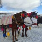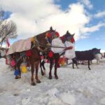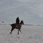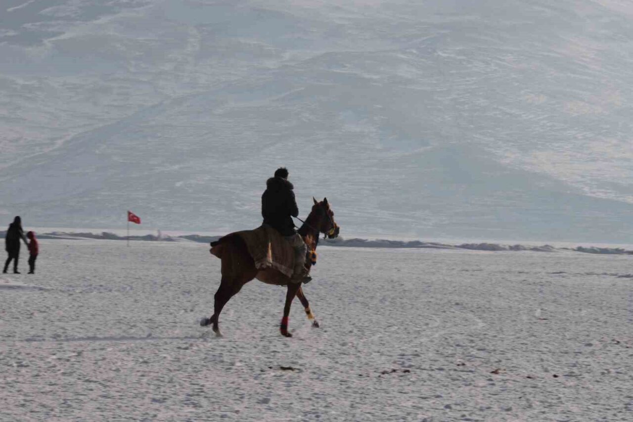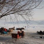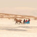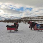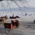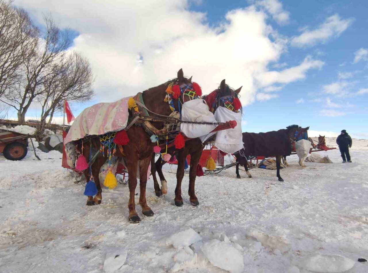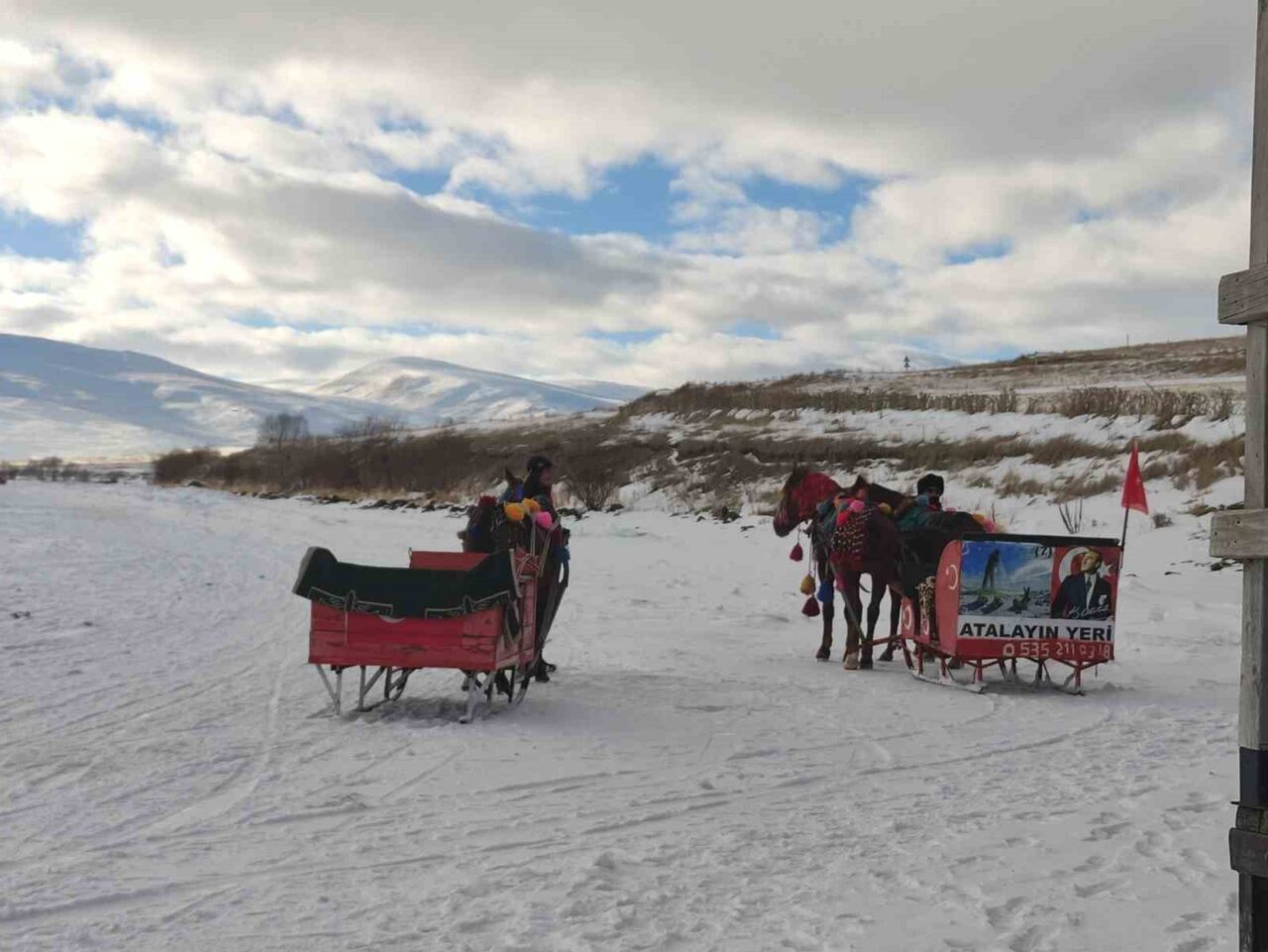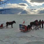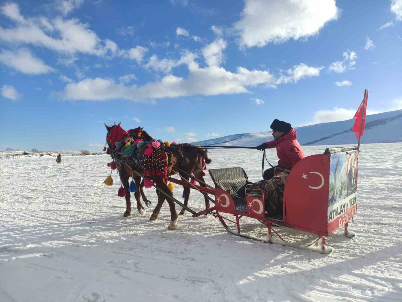 Çıldır Gölü’nün buz tutan yüzeyinde bir süre gezip fotoğraf çeken misafirler, daha sonra sevdikleriyle birlikte atlı kızaklara binerek gölde gezinti yapıyor. Soğuk havaya rağmen saatlerce göl üzerinde kalan vatandaşlar, gönüllerince eğleniyor.