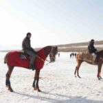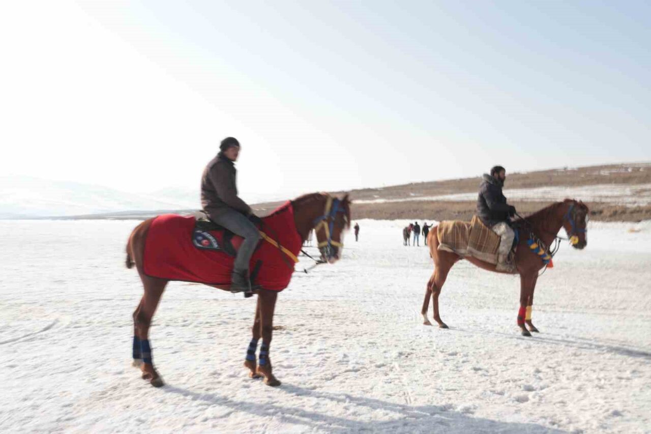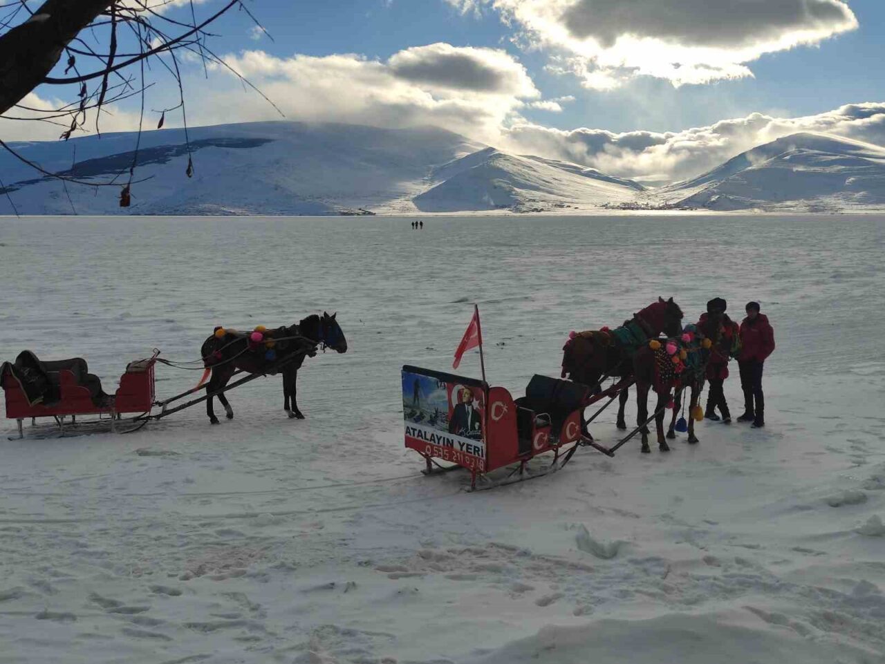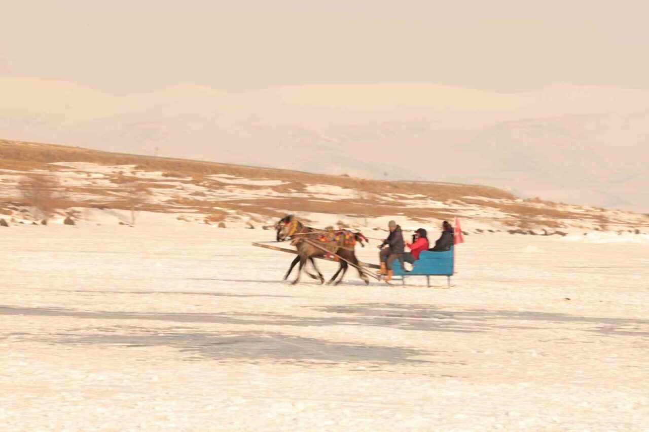 Doğu Anadolu Bölgesi’nin ikinci büyük gölü olan Çıldır Gölü’nün yüzeyi, soğuklardan dolayı 20 santimetre kalınlığında buz oluşturdu. Gölü ziyaret eden turistlerin en büyük eğlencesi ise atlı kızak deneyimi oluyor.