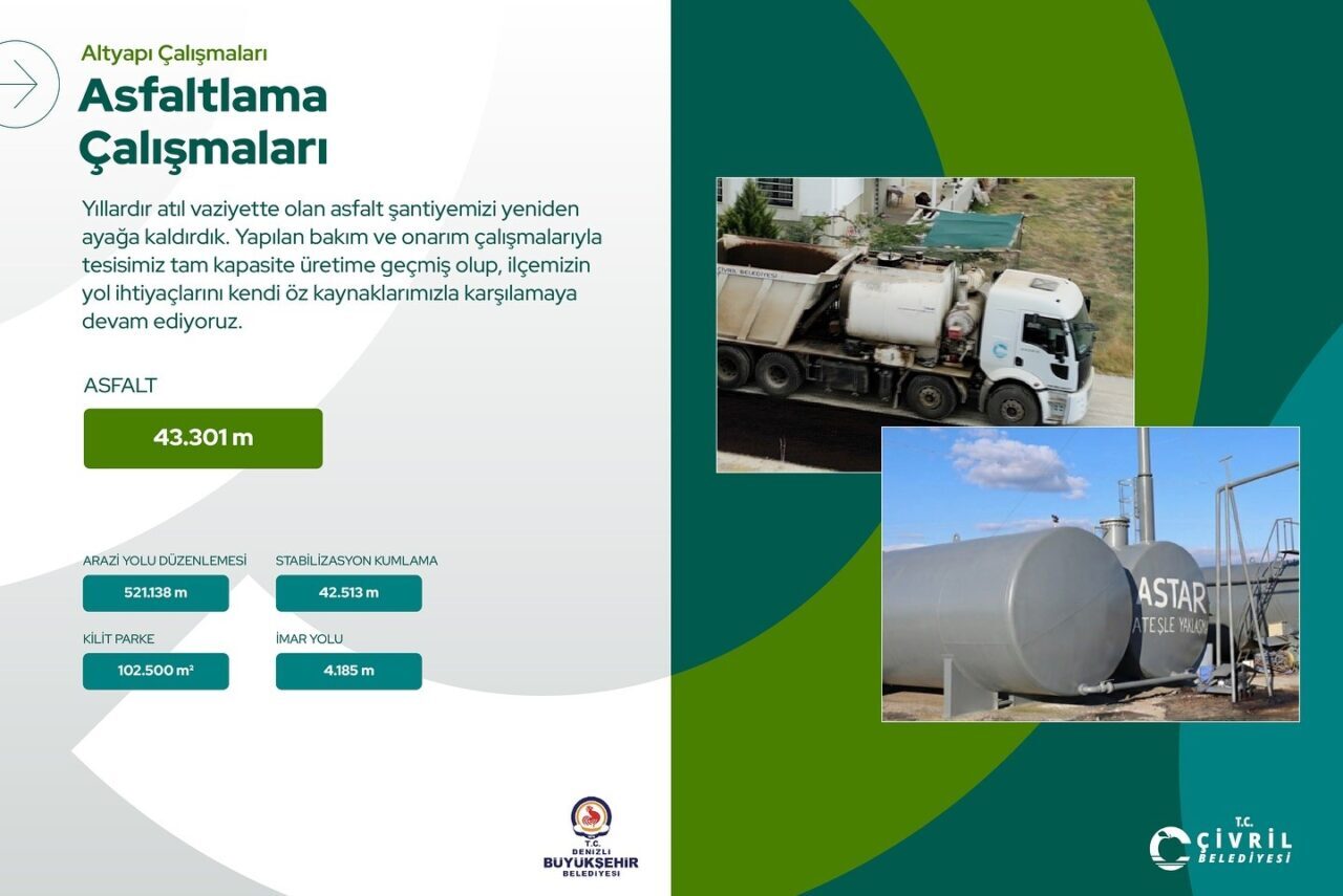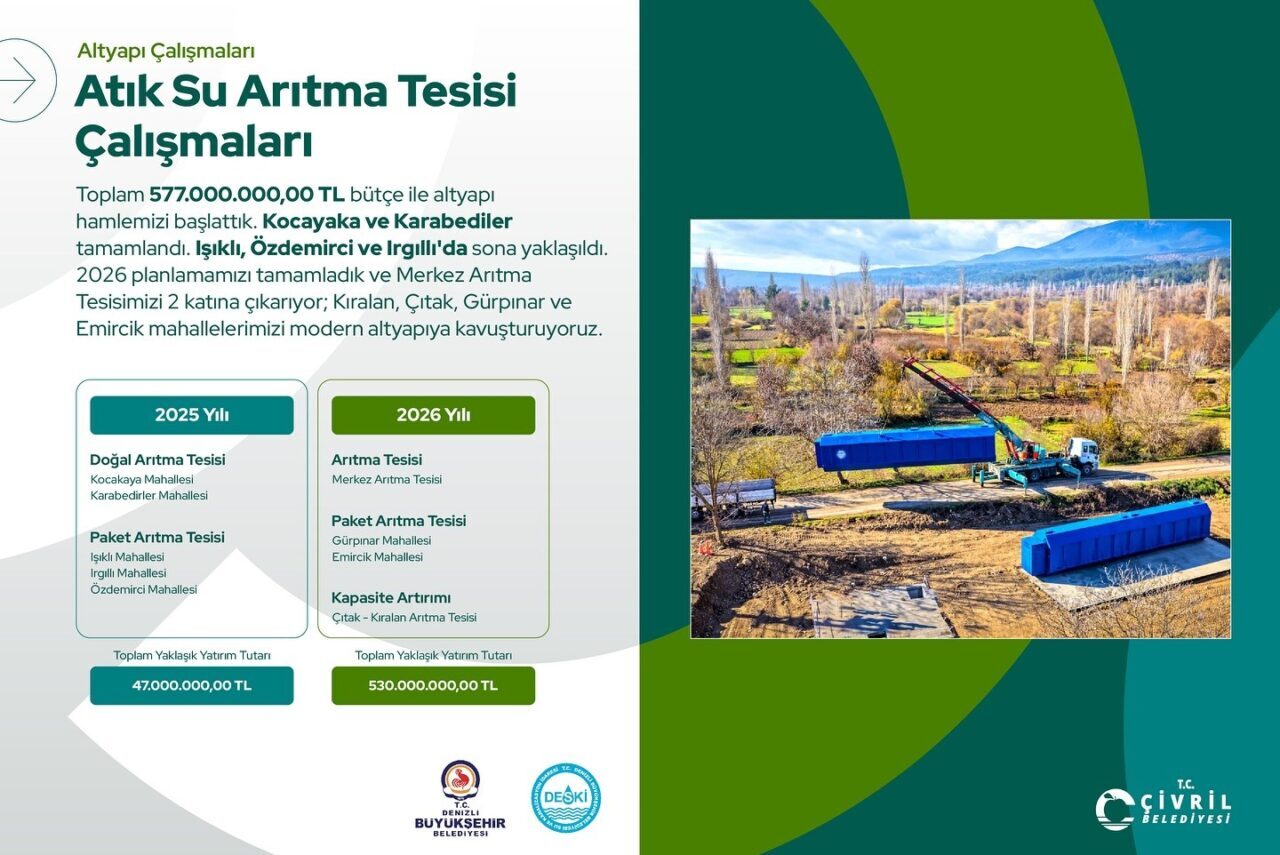 10 bin 217 metre yeni içme suyu hattı, 3 bin 138 metre kanalizasyon hattı ve bin 215 metre yağmur suyu hattının yenilendiğini açıkladı. Ayrıca 577 milyon TL’lik bütçe ayrılarak 2025 yılında Kocakaya, Karabedirler, Işıklı, Irgılı ve Özdemirci mahallelerinde atık su arıtma tesislerinin kurulacağını, Çivril Merkez Arıtma Tesisi ile Güzelpınar, Emircik ve Çıtak-Kıralan Mahalleleri arıtma tesislerinin yapım çalışmalarının ise devam ettiğini ifade etti.